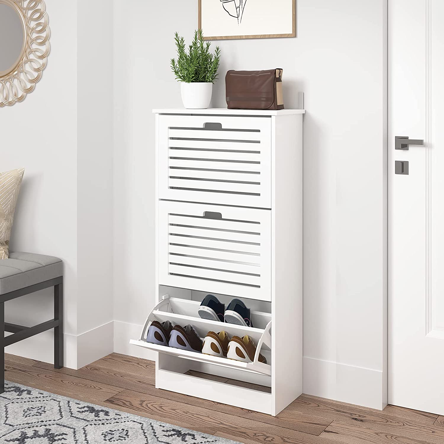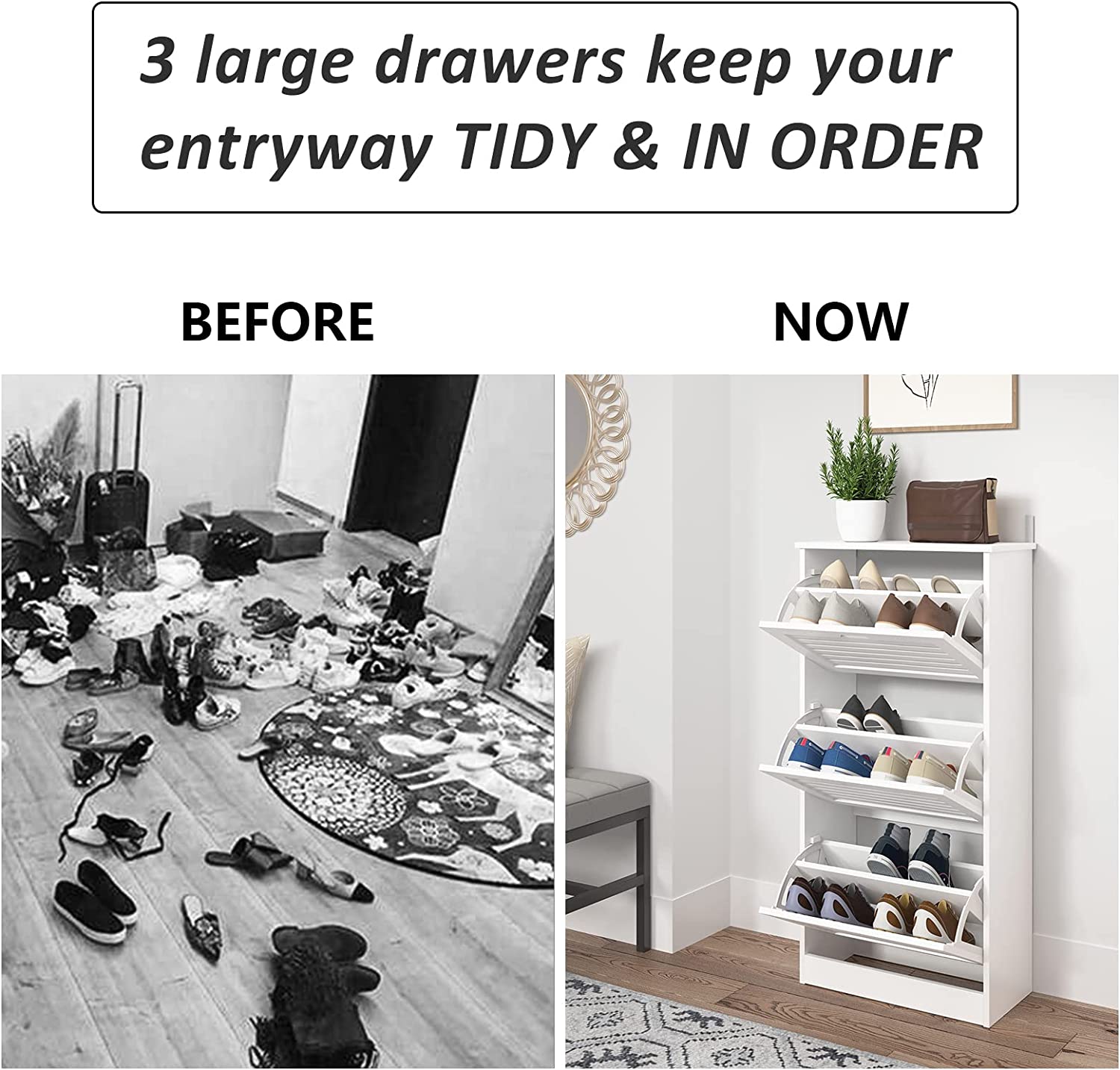 STURDY STRUCTURE: The shoe organizer cabinet adopts waterproof and durable white MDF board, which is easy to wipe. With anti-tipping device on back, it not easy to fall down
