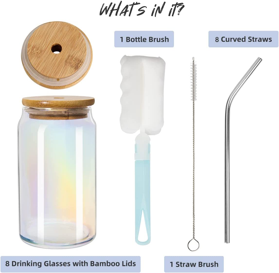 8 Pack Beer Glasses:Juice bottle set includes 8 beer can glasses, 8 nature bamboo lids, 8 stainless steel straws, 1 bottle brush and 1 straw brush.They are all dishwasher safe and refrigerator safe.