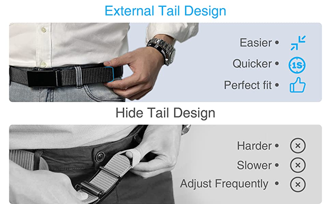 ✦【Easy to Use】Just slide the casual belt into the buckle and pull web belt through, the ratchet buckle simply automatic locks.To release the ratchet belt, gently push the lever on the side of the buckle and pull the webbing out. External sliding design make it easier and quicker.