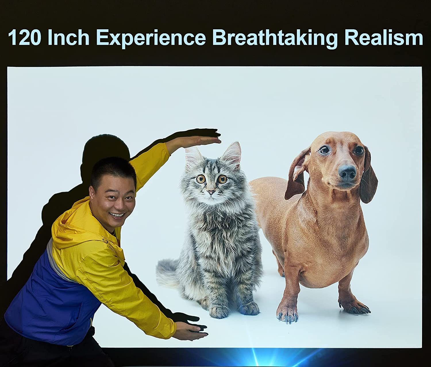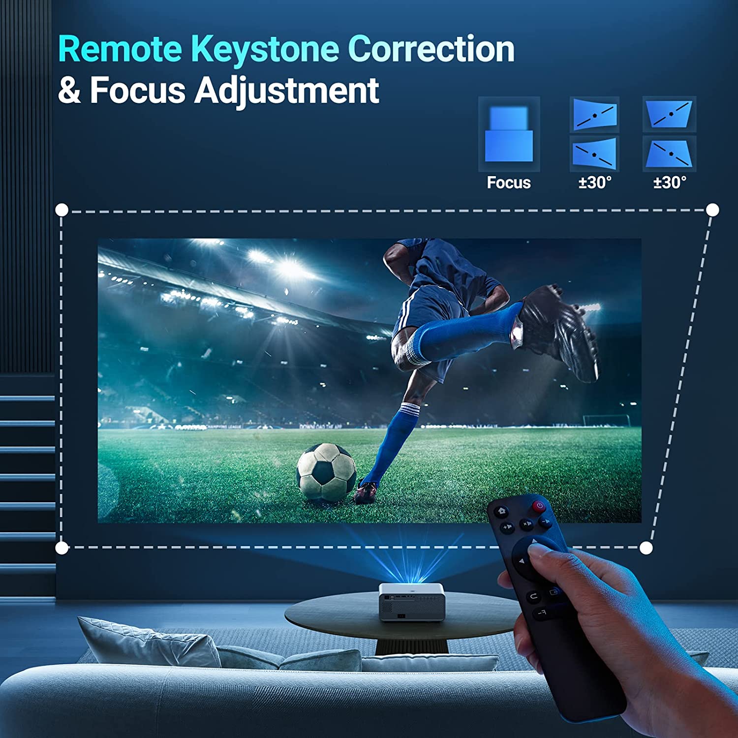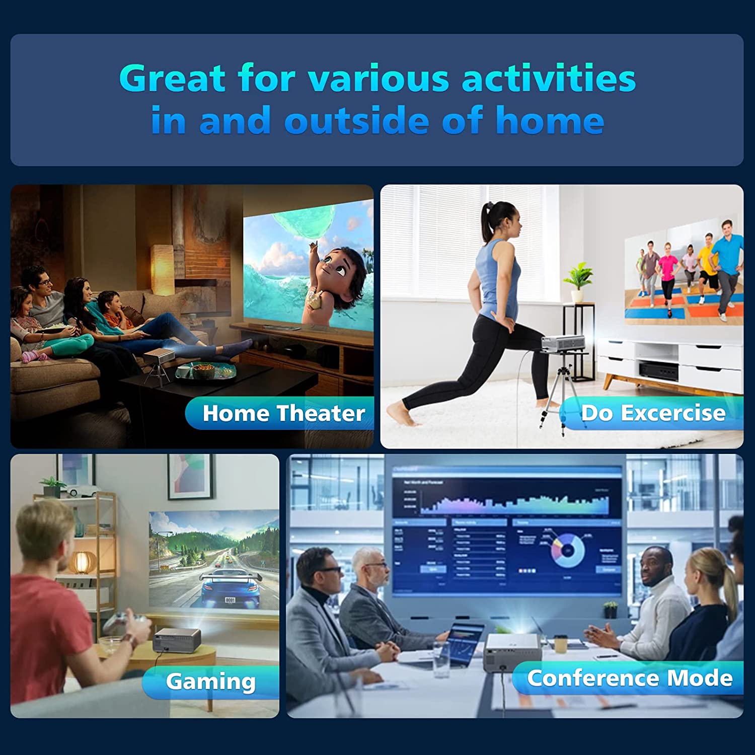 • Projector with Wi-Fi and Bluetooth - Our upgraded movie projector supports 1080P with 3 layers of refractive glass lenses. Blurry edges are outdated, this 4K projector gives a sharper resolution for screens of all sizes. It has a brightness of 450 ANSI for extraordinary vibrant color compared to other 1080p outdoor projectors with Wi-Fi and Bluetooth. Easy and convenient remote-control functions mean you never have to get up and down in the middle of your favorite movie!