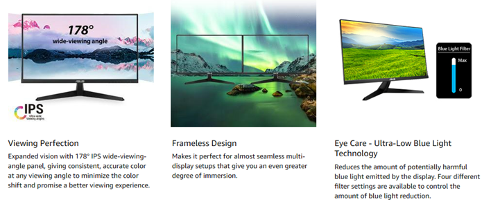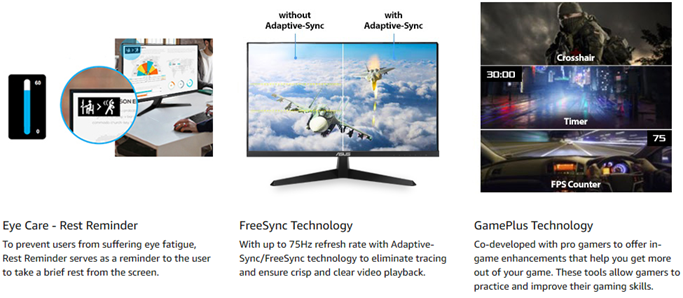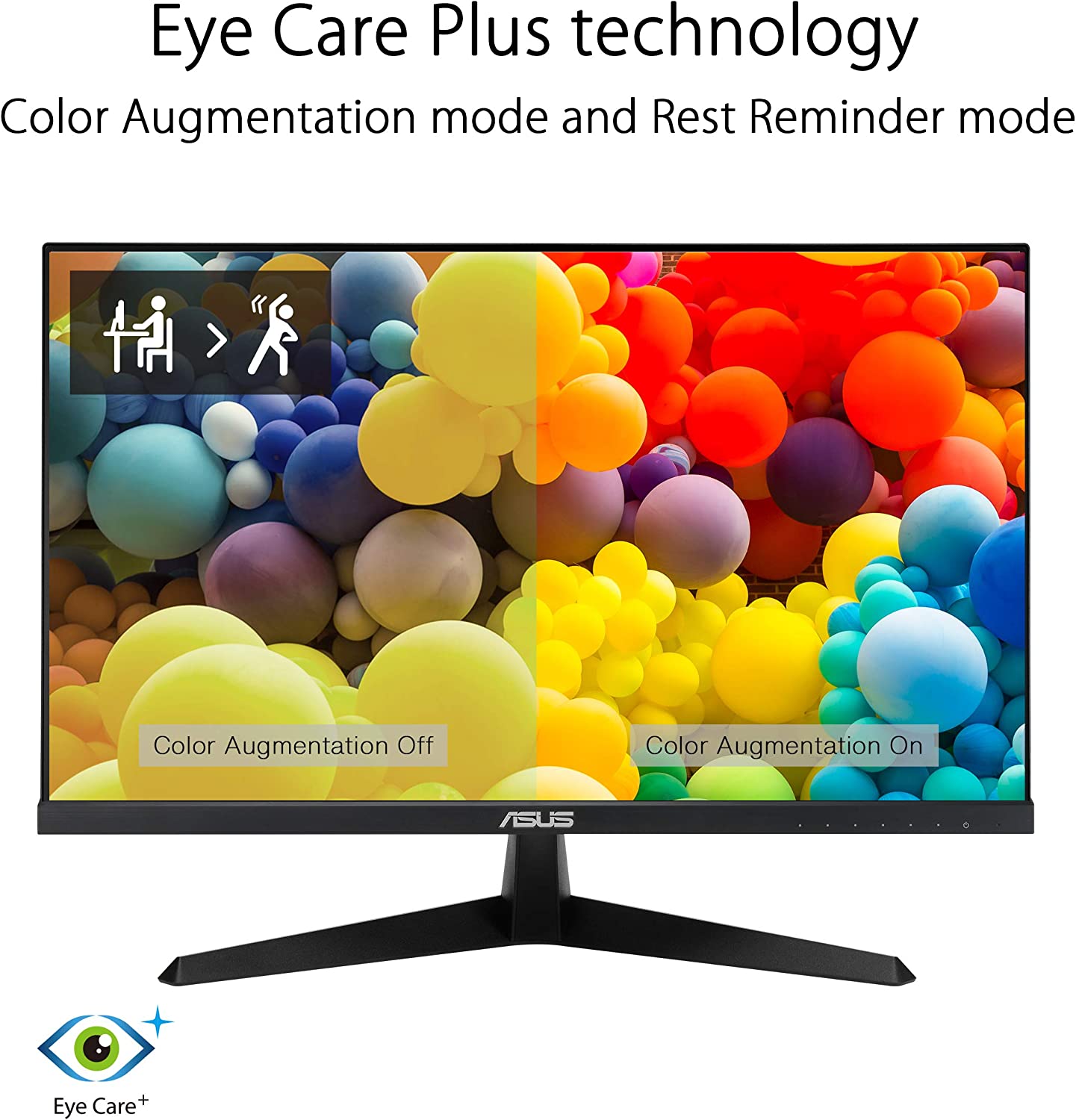 The 23.8” VY249HE monitor is equipped with ASUS BacGuard, a ionic silver treatment applied on the midframe for a more sanitary surface. With Eye Care Plus, the VY249HE features additional color augmentation and rest reminder modes for a more user-friendly experience.