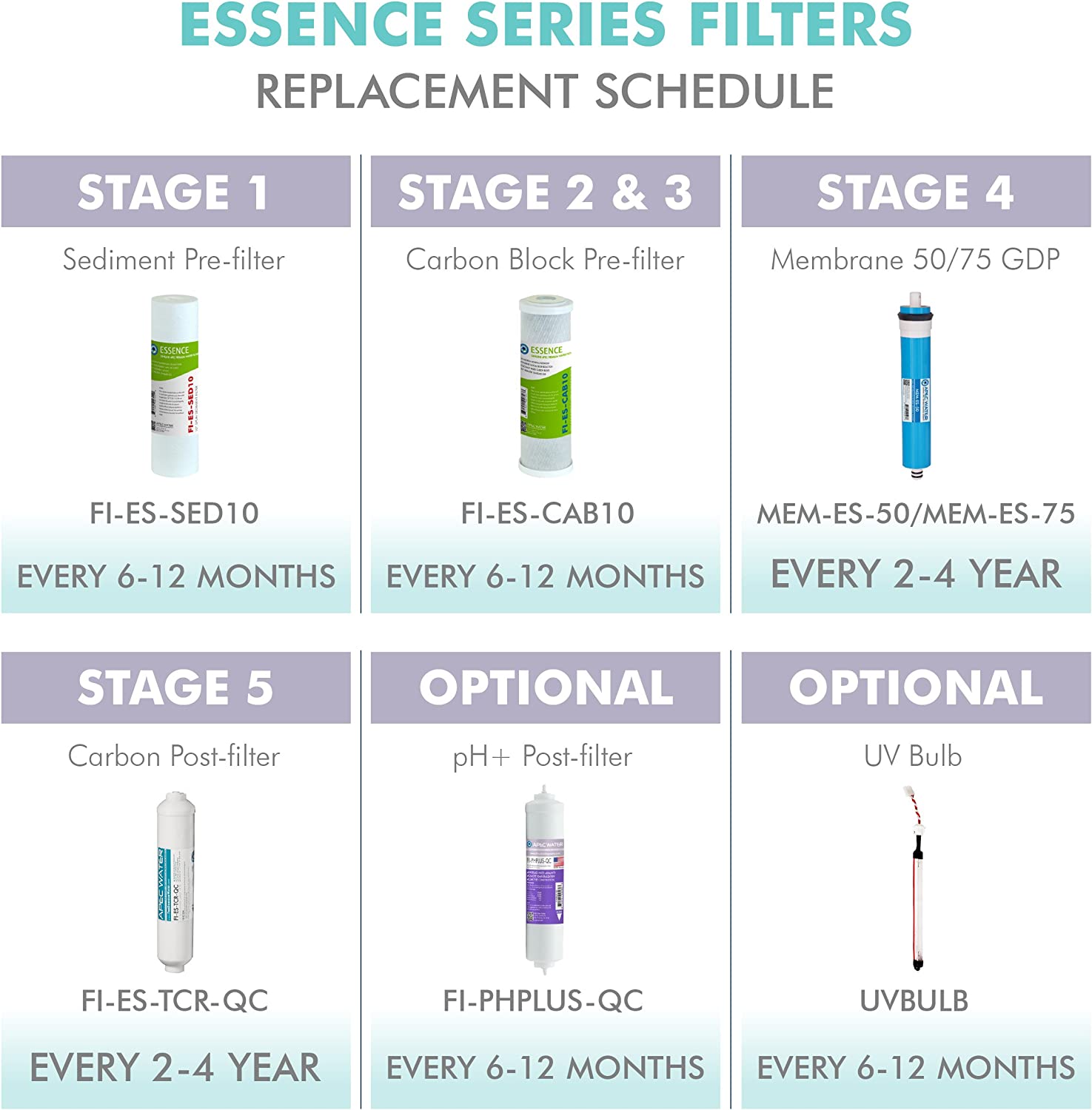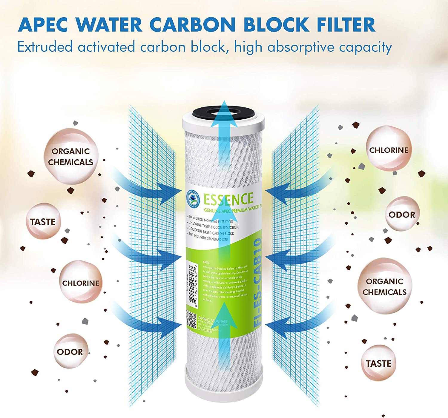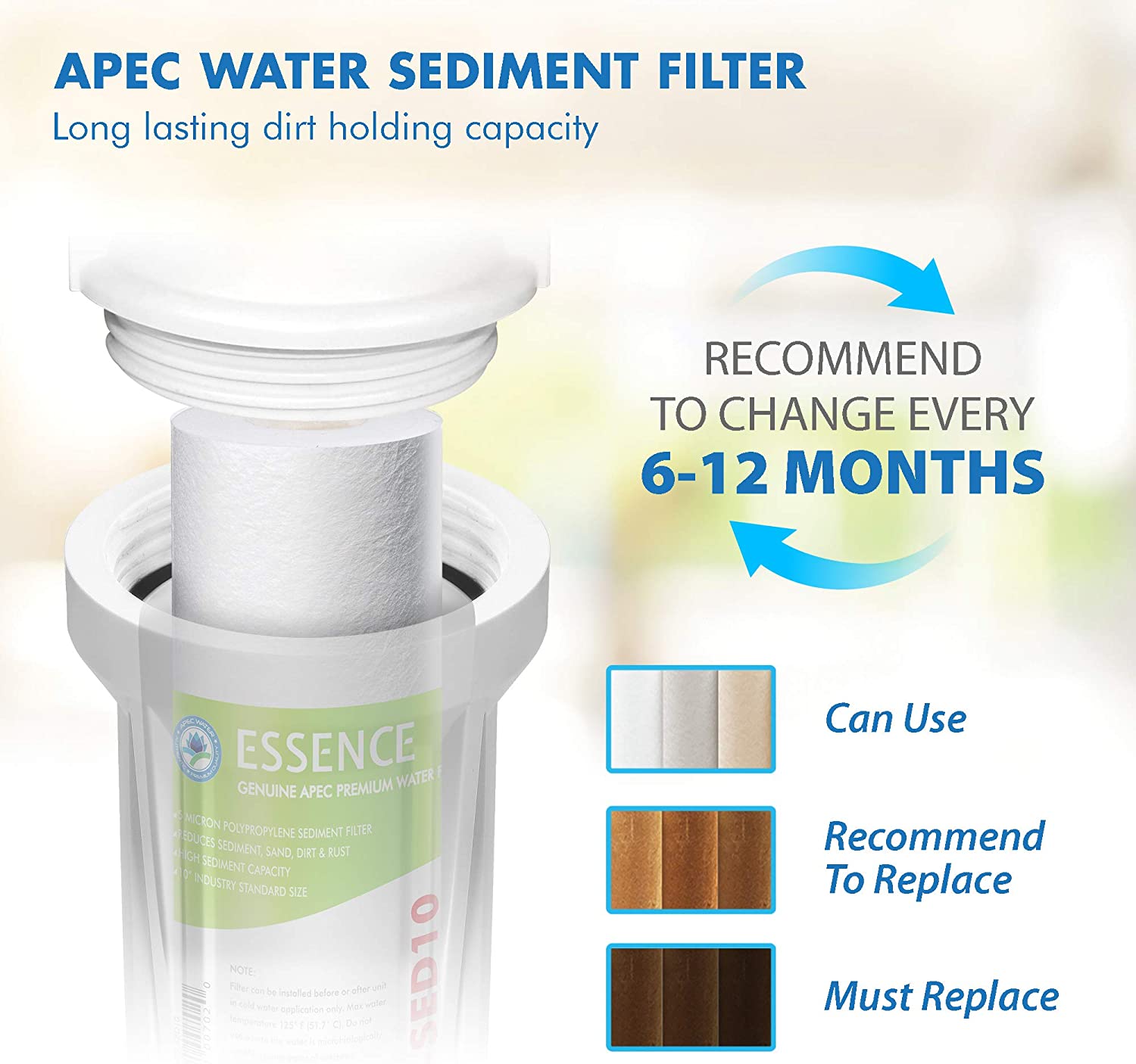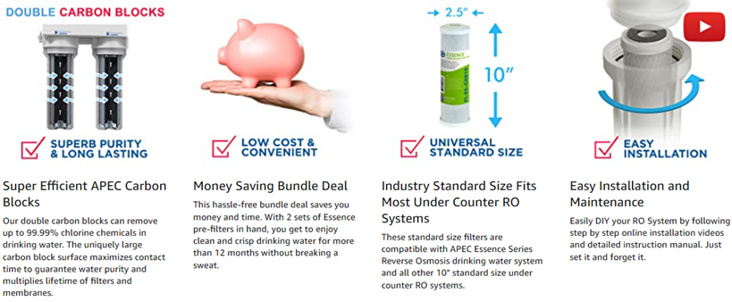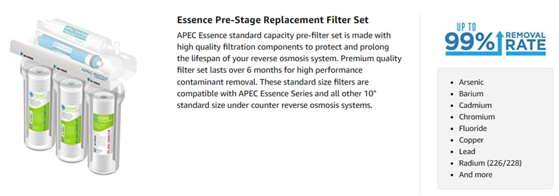 APEC Essence high capacity pre-filter set is made with high quality filtration components to protect and prolong the lifespan of your reverse osmosis system. Premium quality filter set lasts over 6 months for high performance contaminant removal. 1st stage: 5 micron polypropylene filter to remove dust, particles, and rust. Prevent sediment from building up and clogging the filters and the system. 2nd and 3rd stage: 10 micron extruded carbon block filter to remove chlorine, taste & odor at a fast flow rate. Improve water taste, protect the life of the RO membrane and enjoy chlorine free water. Compatible with APEC ROES-50, ROES-75, ROES-PH75, ROES-PHUV75, ROES-UV75, ROES-UV75-SS and all other standard size under counter reverse osmosis systems on the market. About APEC Water Systems For over 20 years, APEC Water Systems has been an industry leading manufacturer who specializes in high performance RO systems. As the original manufacturer, we have dedicated a knowledgeable and sincere team that is committed to providing customer SATISFACTION in hopes to bring many years of enjoyment and good health for you and your family.