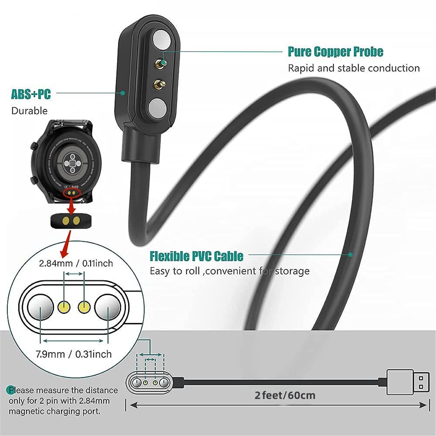 Smart Watch Universal Charger Motion Tracker Charger 2 pin 2.54mm- 2.84 mm Pin Pitch USB Smart Glasses Smart Watch Magnetic Charging Cable Smartwatch Accessories 2 FT/60 cm