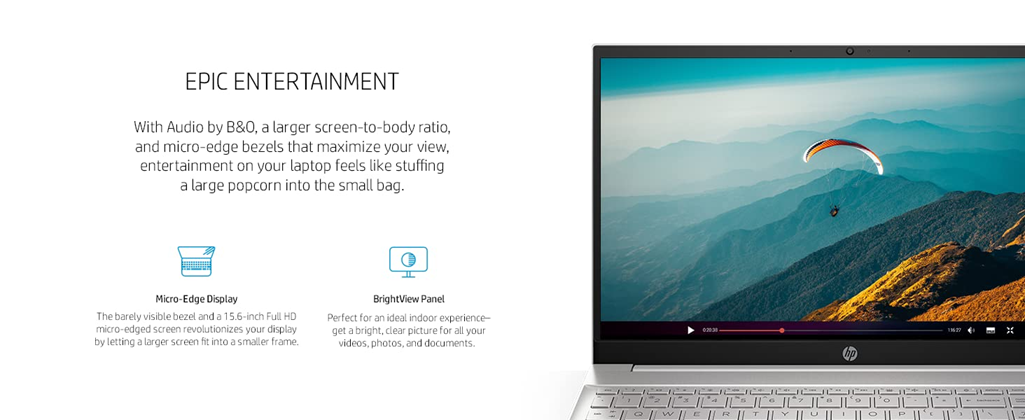 • EPIC ENTERTAINMENT – With audio by B&O, a larger screen-to-body ratio, and a 15.6-inch Full HD micro-edged screen to maximize your view, entertainment on your laptop feels like bringing the theater home (1). HP speakers, custom-tuned in collaboration with experts at Bang & Olufsen, bring entertainment to life with sound you can feel.