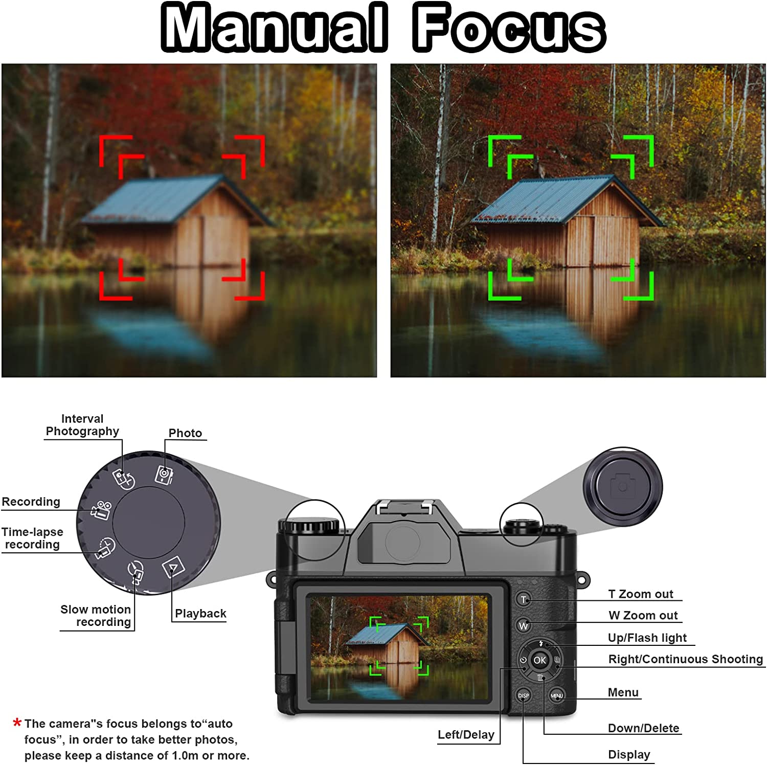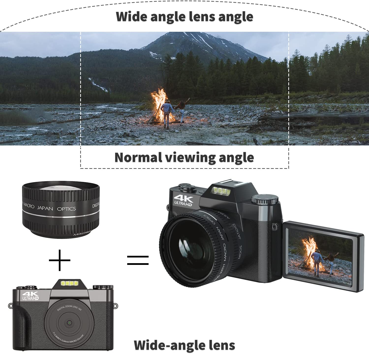 • ?【Digital Camera with Wide Angle Lens & Macro Lens】The 4K camera equipped the camera with a professional detachable 52mm wide angle lens with macro lens, so the camera is great for capturing wide horizons easily, and macro lenses capture the diversity of the tiny world. Sharp 4K photos can be ruled out with manual focus. With a knob on the top of the camera, you can switch between photos, video, time-lapse photography and other features.