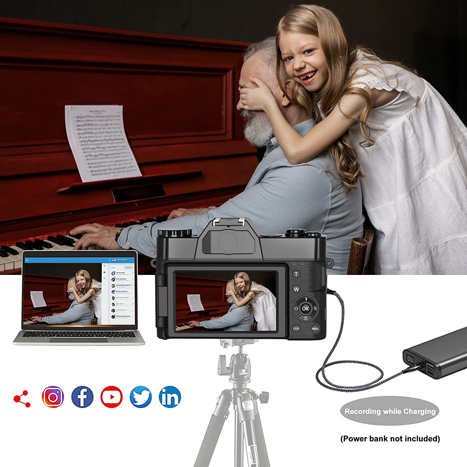 • ?【Vlogging Camera with PC camera & HDMI output】The vlogging camera can be connected to the PC via a USB cable. Then you can choose "Mass Storage Mode" to transfer files to your computer or choose "PC Camera" to use it as a PC camera to enjoy video chat or live broadcast. If you want to play the video you shoot, the digital camera supports HDMI function, you can use HDMI cable to directly connect to HDTV (HDMI cable is not included).