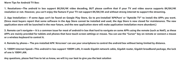 - App Installation— If some Apps can't be found on Google Play Store, Go to the tv box pre-installed 'APKPure' or "Aptoide TV" to install the APPs you want.