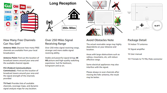 - If the signal is not satisfying or only a few channels are available, try connecting or removing the amplifier. (You can Remove the Detachable signal amplifier if your house is within 20 miles range from the tower. We do NOT Recommend to use the signal amplifier if your house is very close to the broadcast tower and the signal is already very strong.)