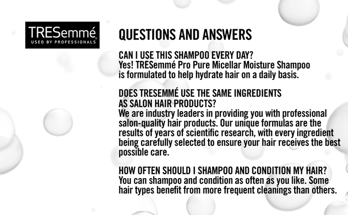 • DO IT WITH YOUR STYLE: With TRESemmé professional hair care, like our Pro Pure Micellar Moisture Collection, you can create your personal style to achieve your aspirations with confidence