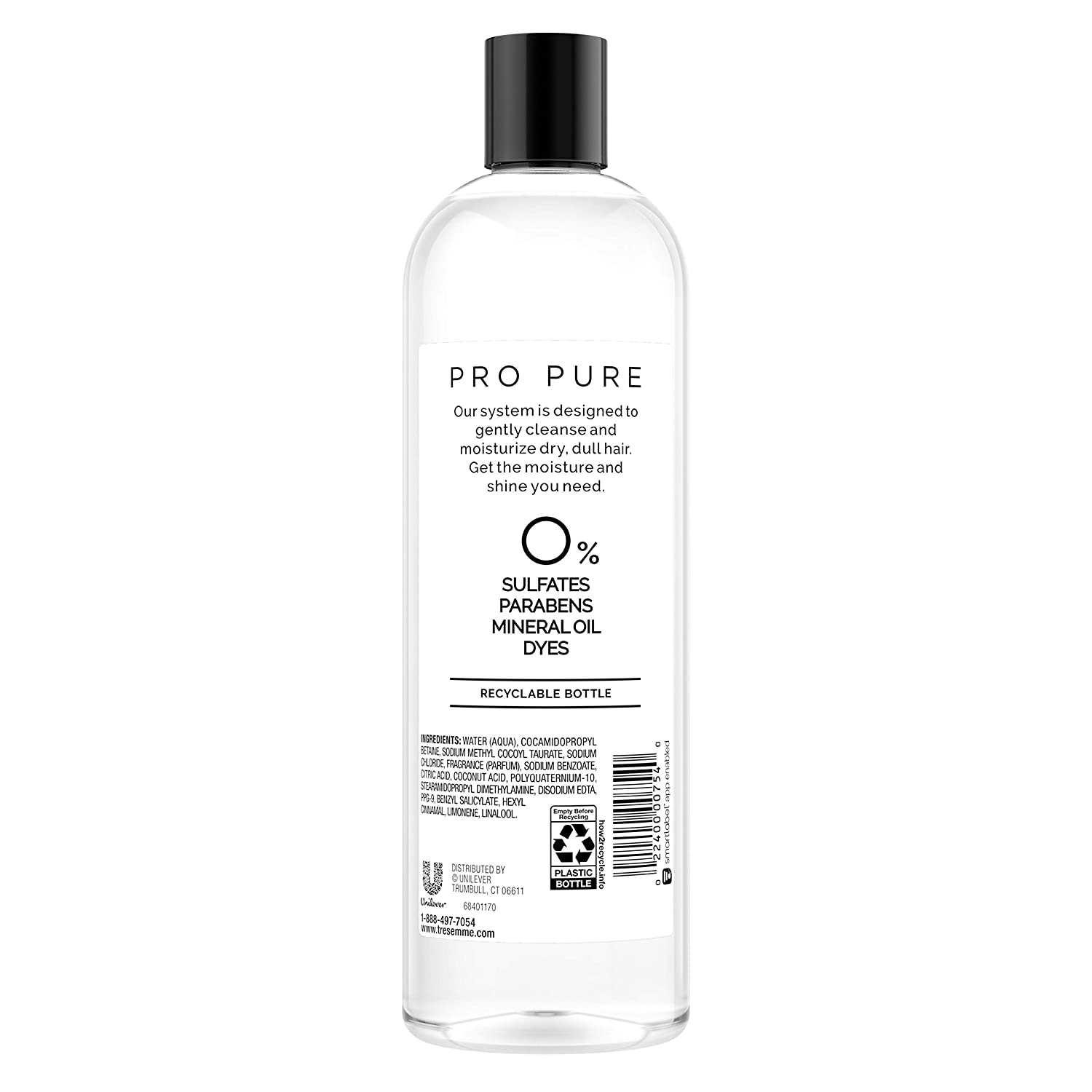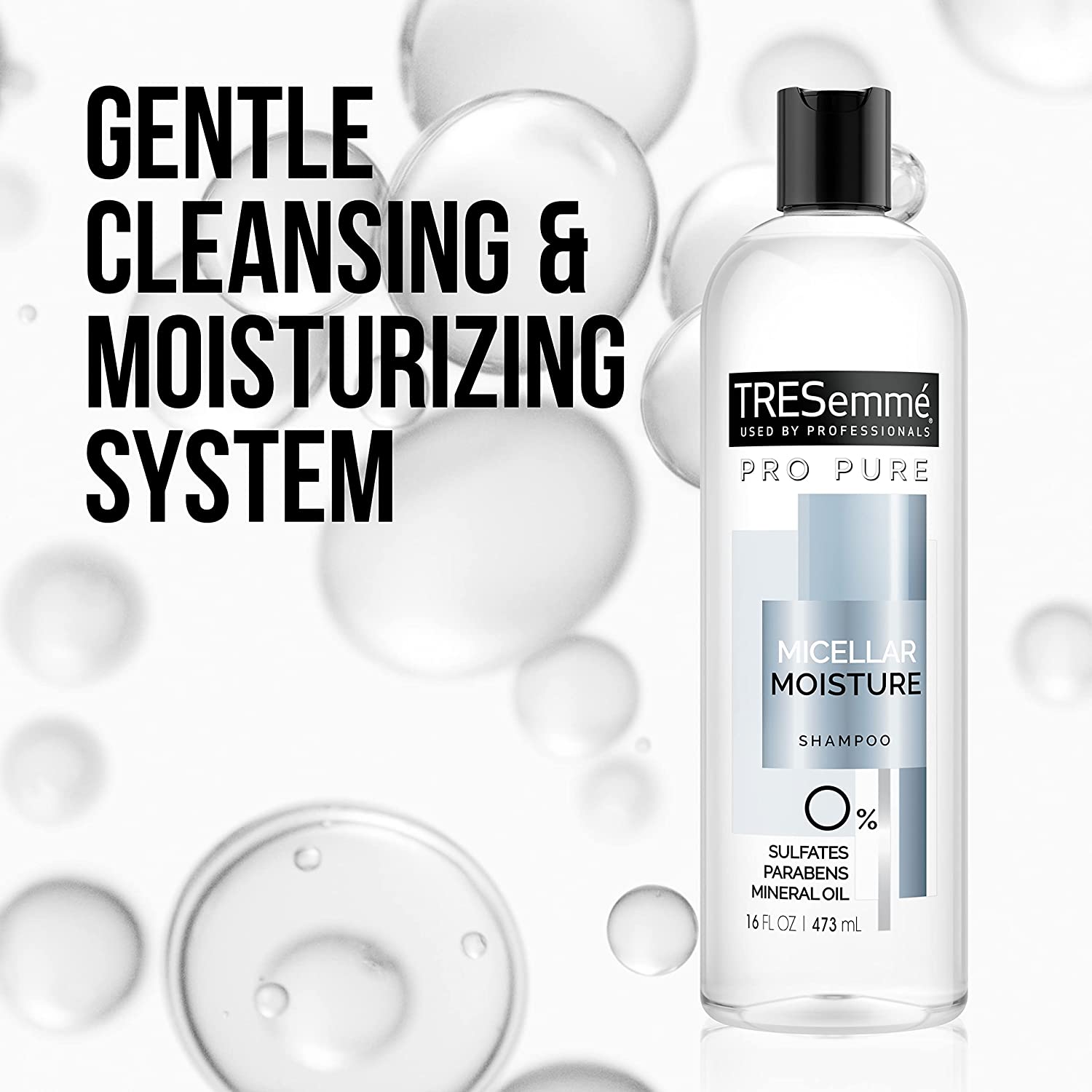 TRESemmé Pro Pure Micellar Moisture Shampoo is your weightless cleansing solution for dry, dull hair. This shampoo is made with 0% sulfates, parabens, mineral oils and dyes.