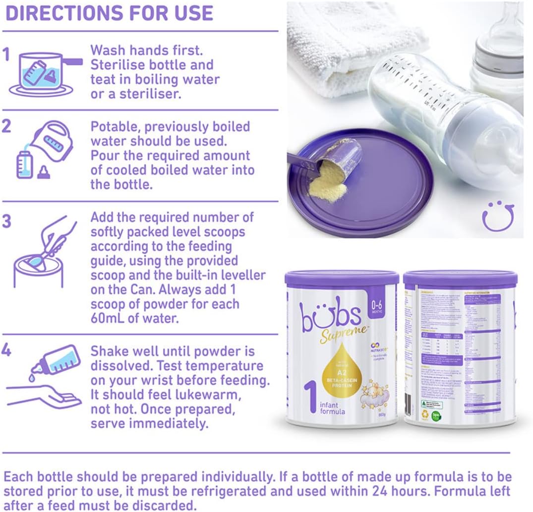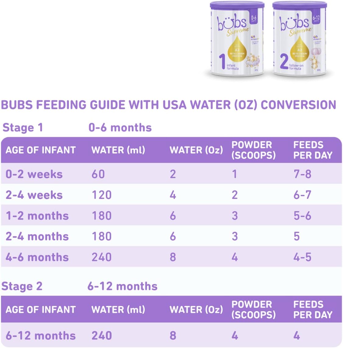 • NUTRITIONALLY SAFE: Bubs Supreme Infant Formula Stage 1 is an Australian-made baby formula exclusively formulated for tiny tummies ages 0-6 months, feeding up to 8 times per day, all while made to ensure safety, quality, purity, and nutrition
