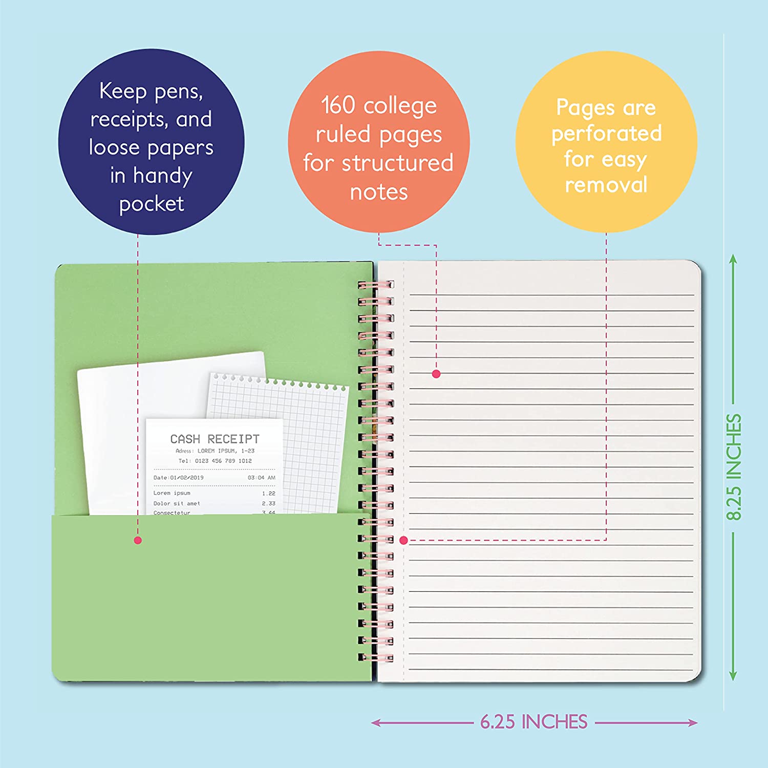• A Pocket Always Helps — It's annoying to find important scraps of paper crumpled at the bottom of your bag. These spiral notebooks college ruled journals include a double-sided pocket page to store pens, receipts and loose papers