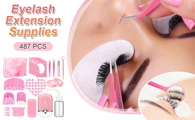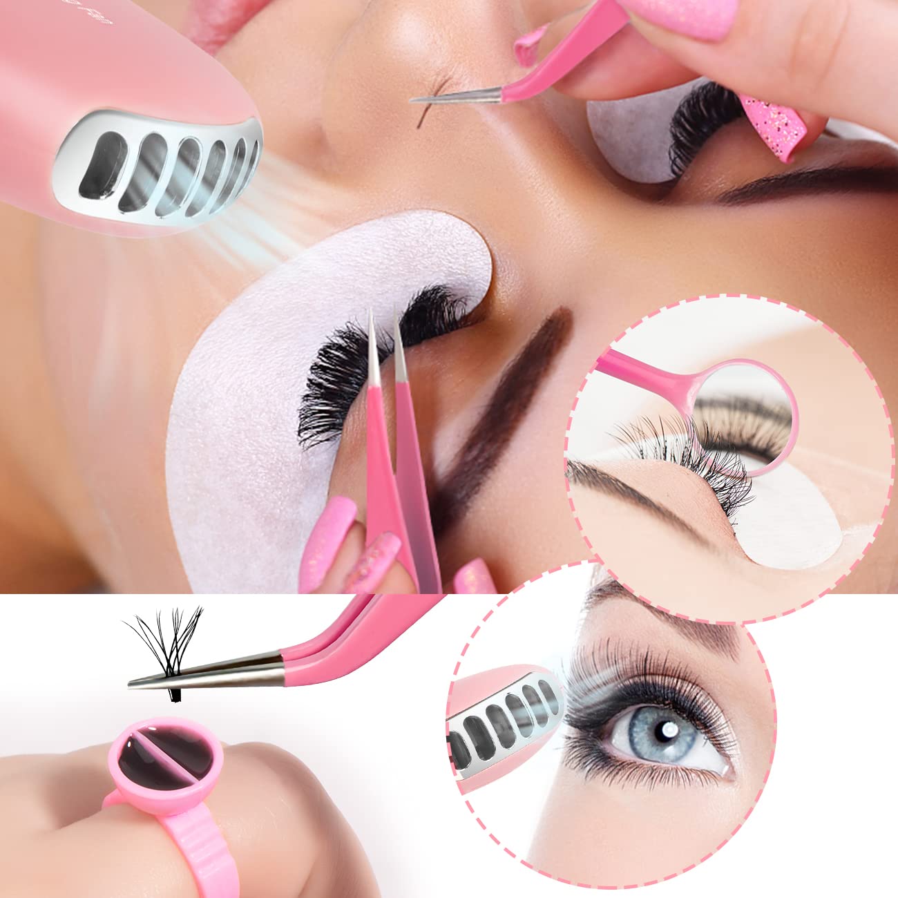 487PCS Eyelash Extension Kit Lash Extension Supplies for Beginners and Professionals, Lash Lift Eyelash Perm, Including Mini Fan Lash Dryer, Tweezers, Glue Rings, Mascara Brushes, Eye Gel Pads