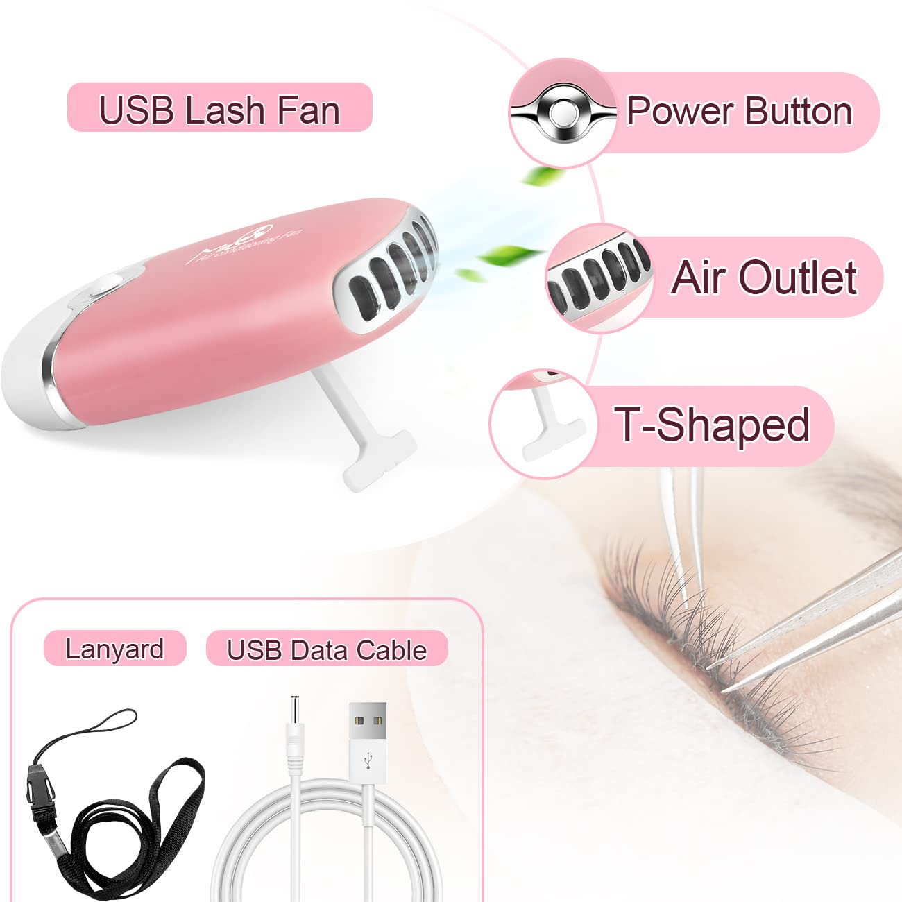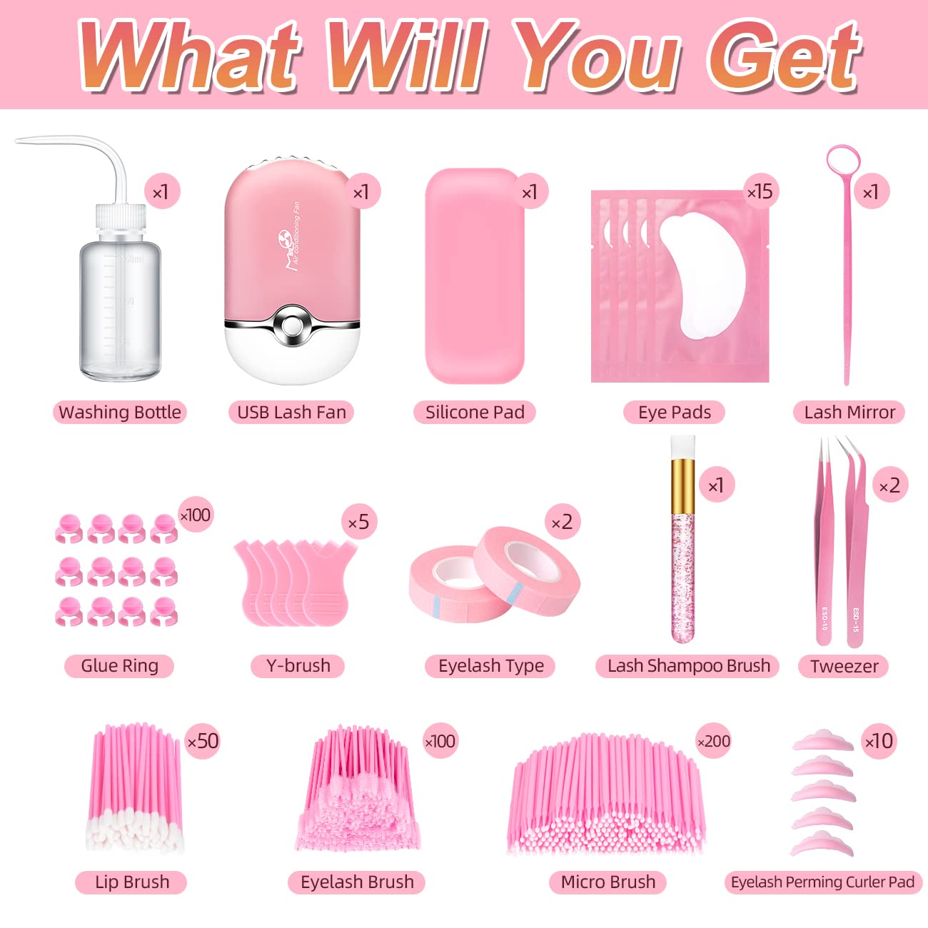 • 【Package Included】 487 pieces lash extension kit includes 1PC of USB mini rechargeable eyelash air conditioning fan with data cable and lanyard, 1PC of washing bottle, 1PC of silicone pad, 15PCS of eye pads, 1PC of lash mirror, 100PCS of glue ring, 5PCS of Y-brush, 2PCS of eyelash type, 1PCS of lash shampoo brushes, 2PCS of tweezer, 50PCS of lip brush, 100PCS of eyelash brush, 200PCS of micro brush, 10PCS of silicone eyelash perming curler pad.