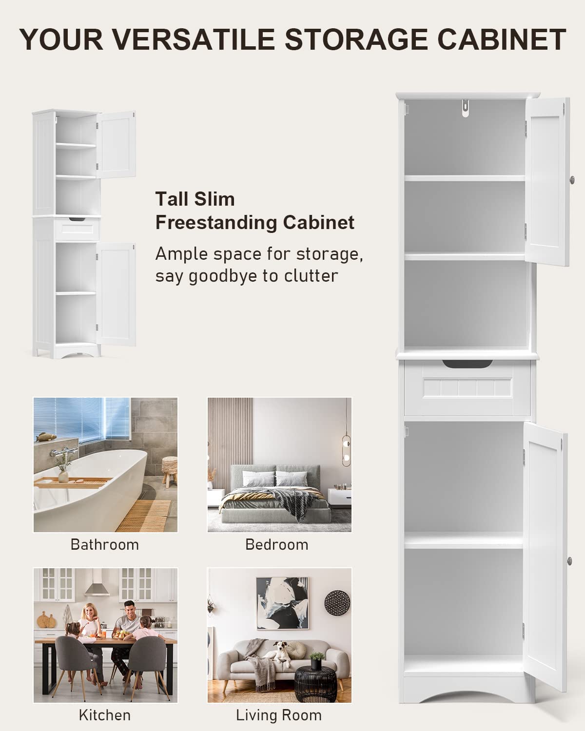 • Versatile Tall Linen Tower for Storage: This vertical freestanding cabinet is not only a bathroom cabinet for toiletries, but also a display shelf in the living room to place trophies, collections, a pantry in the kitchen to put spices and tableware, or a bookcase in the study or bedroom for books and clothes. Help you get a tidy and clean living space.