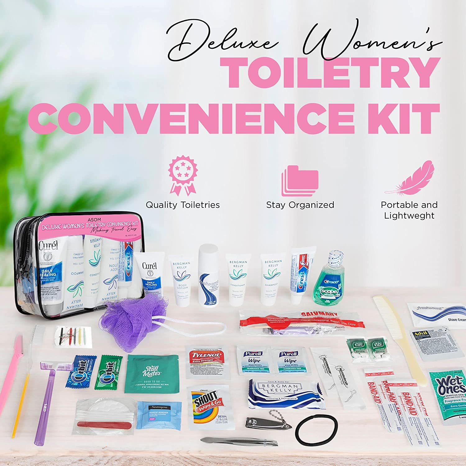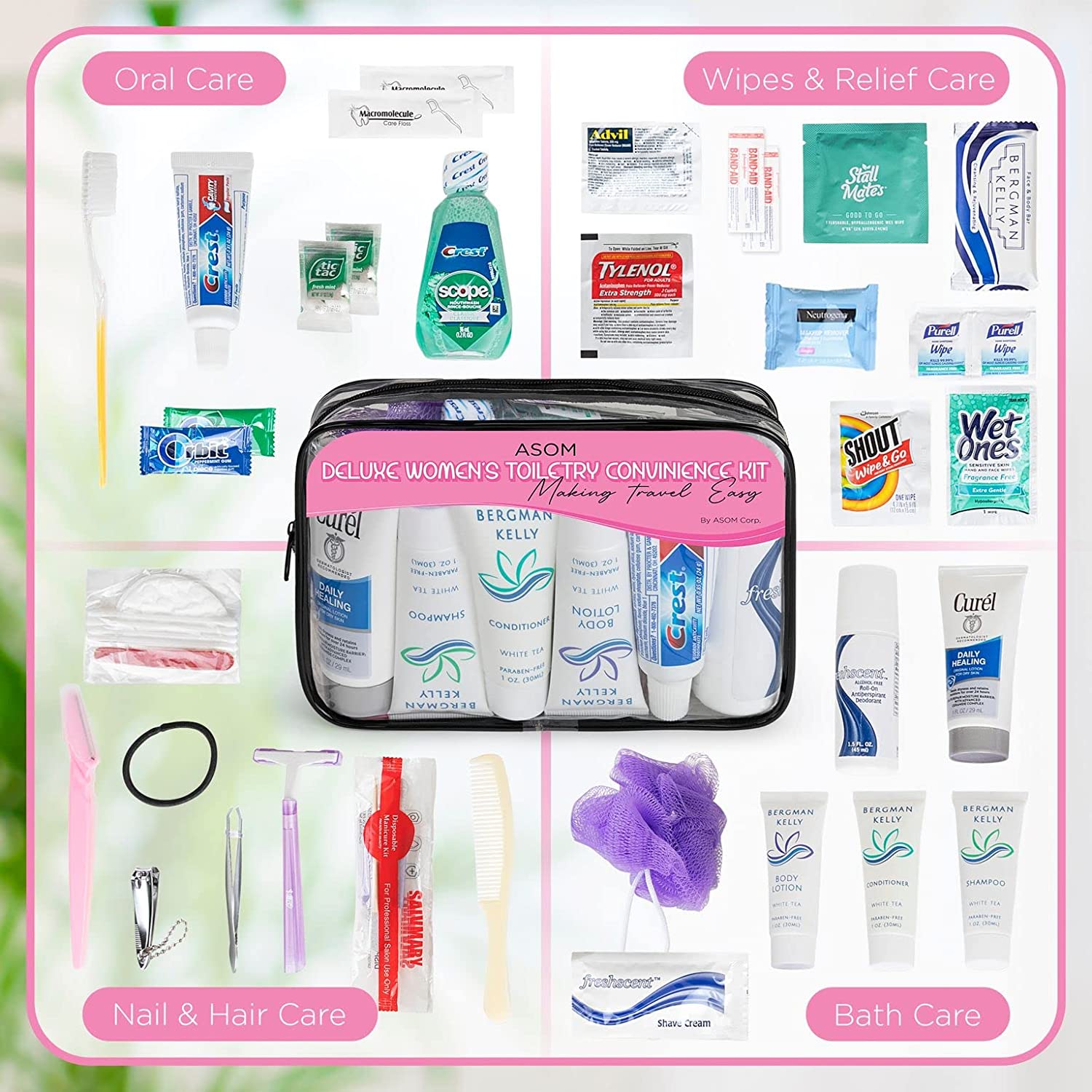 Asom Travel Toiletries Women Convenience Kit, Personal Care Toiletry Accessory Wellness Hygiene Essentials Set, TSA Approved Clear Traveling Bag Toiletry Accessories Kits, 36 Pc.