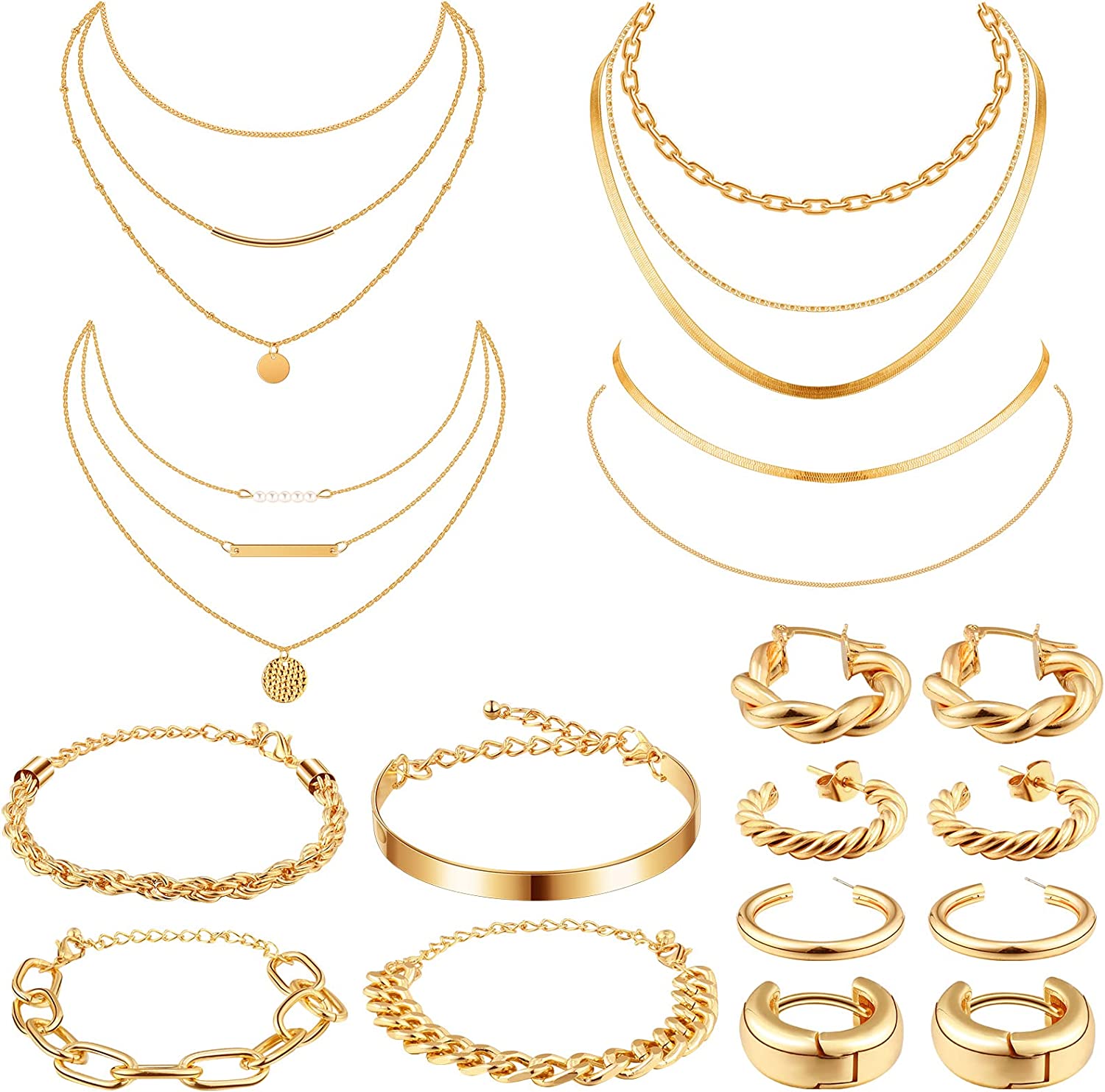 • Charm Gold Jewelry Set: the women's jewelry sets contains 4 pairs gold hoop earrings, 4 gold bangles bracelets for women, and 4 gold necklaces, enough quantity and different styles to fully meet your daily or party use, making you more elegant