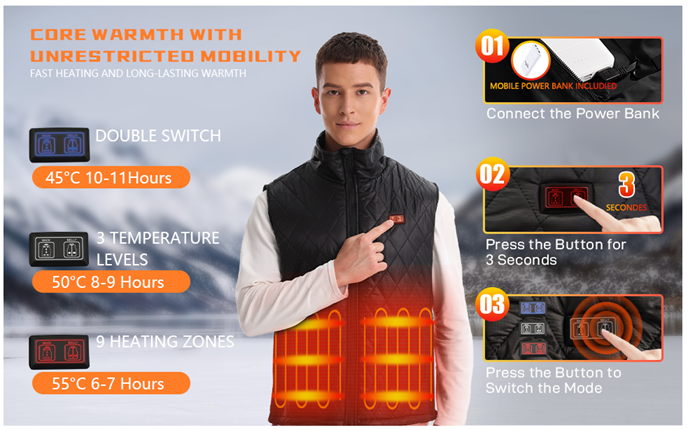 - Customer Service -Please check the size chart before purchasing, if you don't know what to choose, please contact us via email. Any questions with our heated vests , please feel free to contact us via email, we will do our best to help you solve the problem in 24 hours.