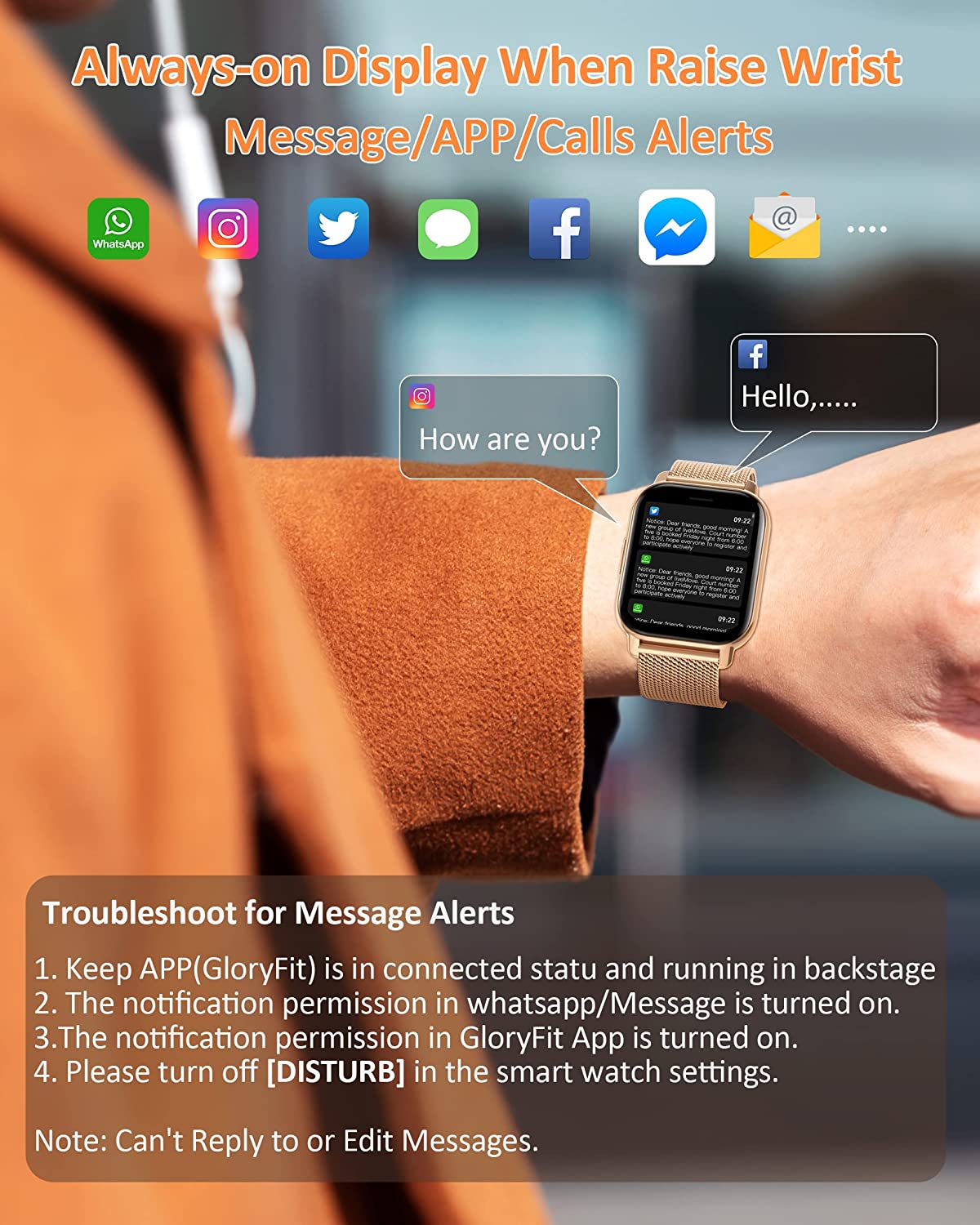 • ?【Smart Alerts of Message/App & Always-on Display】After paired with phone via GloryFit, it can sync and push all the messages, calls and other APP notifications on watch, letting you never miss each vital info(Need to allow all the permissions to App); With just a turn your wrist and glance at the watch, you can check the time, the incoming SMS or calls, or see a real-time heartbeat, even when your hands are not free(Note: Can't reply to or edit messages).