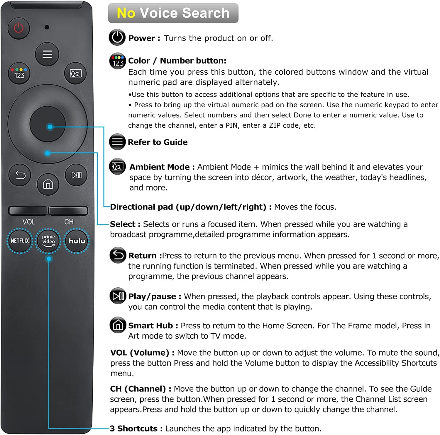 • 【Completely Compatible】 The upgrade universal remote control compatible with All Samsung Frame Crystal UHD Neo QLED OLED 4K 8K Smart TVs. And it can replace most of Samsung remote controls, is a good backup remote for your Samsung smart TVs.