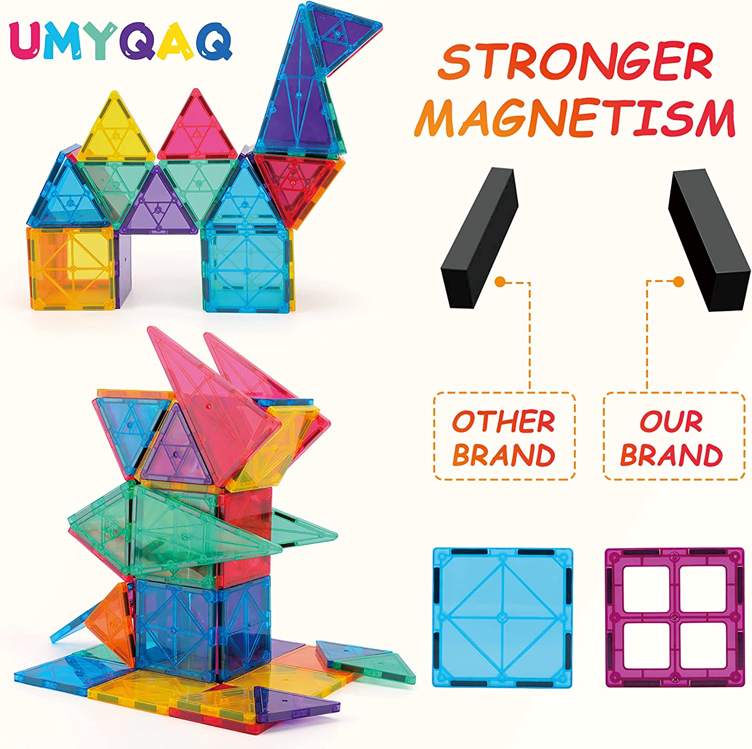 Safe and Stronger Magnets: A "CPC" certified magnetic tile made of safe and durable ABS plastic. The smooth surface and rounded edge design won't scratch or hurt little hands. The magnet is nickel-plated, with a stronger magnetic force and stronger splicing. The magnets are sealed with rivets to prevent the tiles from cracking or swallowing.