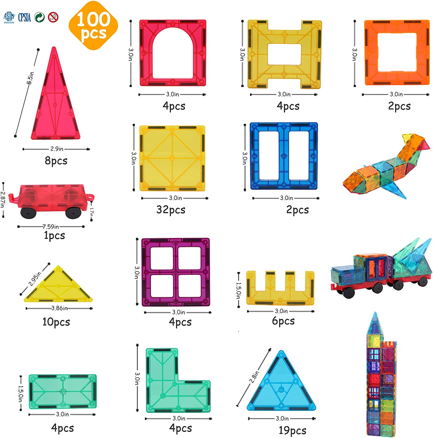 Educational STEM Toys: 100 magnetic blocks with unique DIY models in different shapes, suitable for children's brain development. Children can create various 2D flat shapes or 3D geometric figures. Tiles can be combined into houses, balls, flowers, animals, cars, castles, planes.