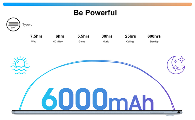 - Note: Battery life may vary depending on device settings, usage, and other factors such as web browsing and downloading content. Certain applications or software features may decrease battery life. Do not charge the battery overnight. Please charge it as soon as possible when the tablet power is below 20%. If you don't use the tablet for a long time, please make sure the battery has more than 60% power. and shut down the tablet to save it properly.