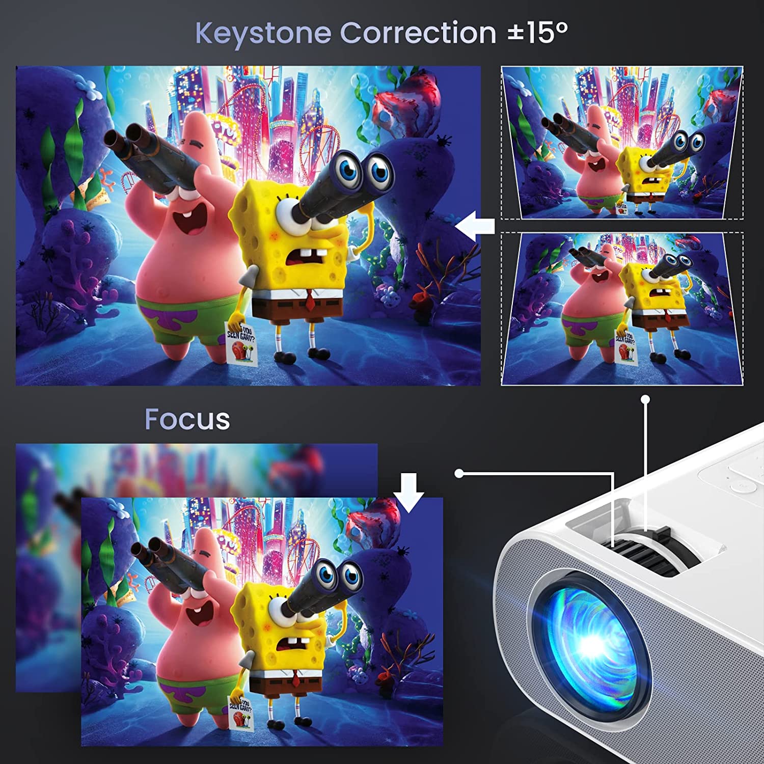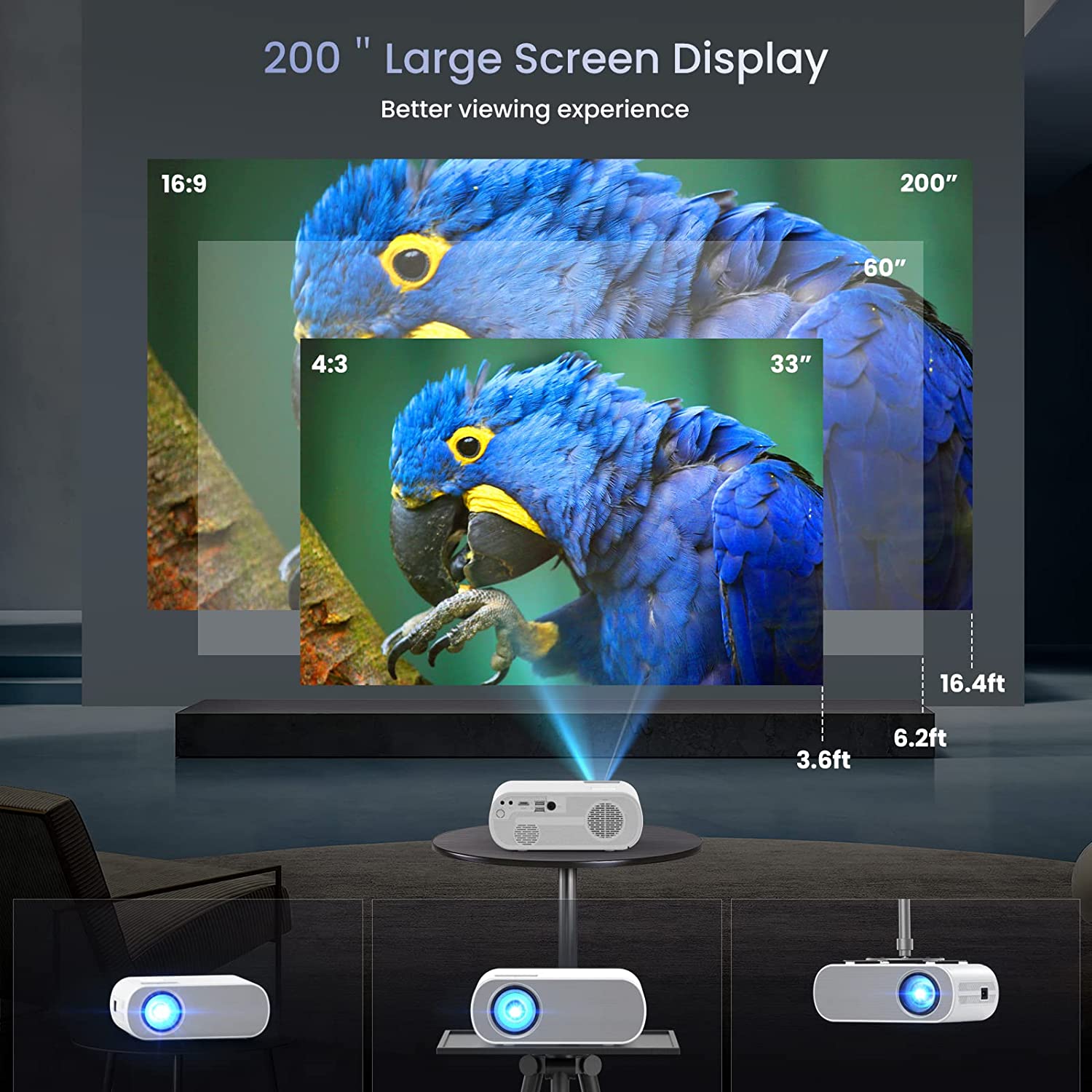 • ?【200'' Giant Screen & ±15° Keystone Correction & 50% Zoom】: The portable projector provides a 50-300-inch projection display at a projection distance of 5.41-18.4 feet, with a 4:3/16:9 aspect ratio, 50-100% zoom function, and 15° keystone distortion correction for optimal viewing in both home theaters and outdoor movies!