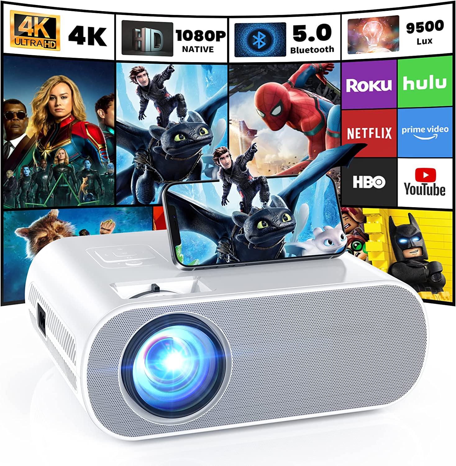 • ?【Native 1080P Full HD resolution】: If you have a high requirement for clarity of projector, this Full HD projector must be your favorite. With a resolution of 1920*1080, a brightness of 9500L, and a dynamic contrast ratio of up to 10000:1, the projector shows a more clearer, brighter, and richer picture.