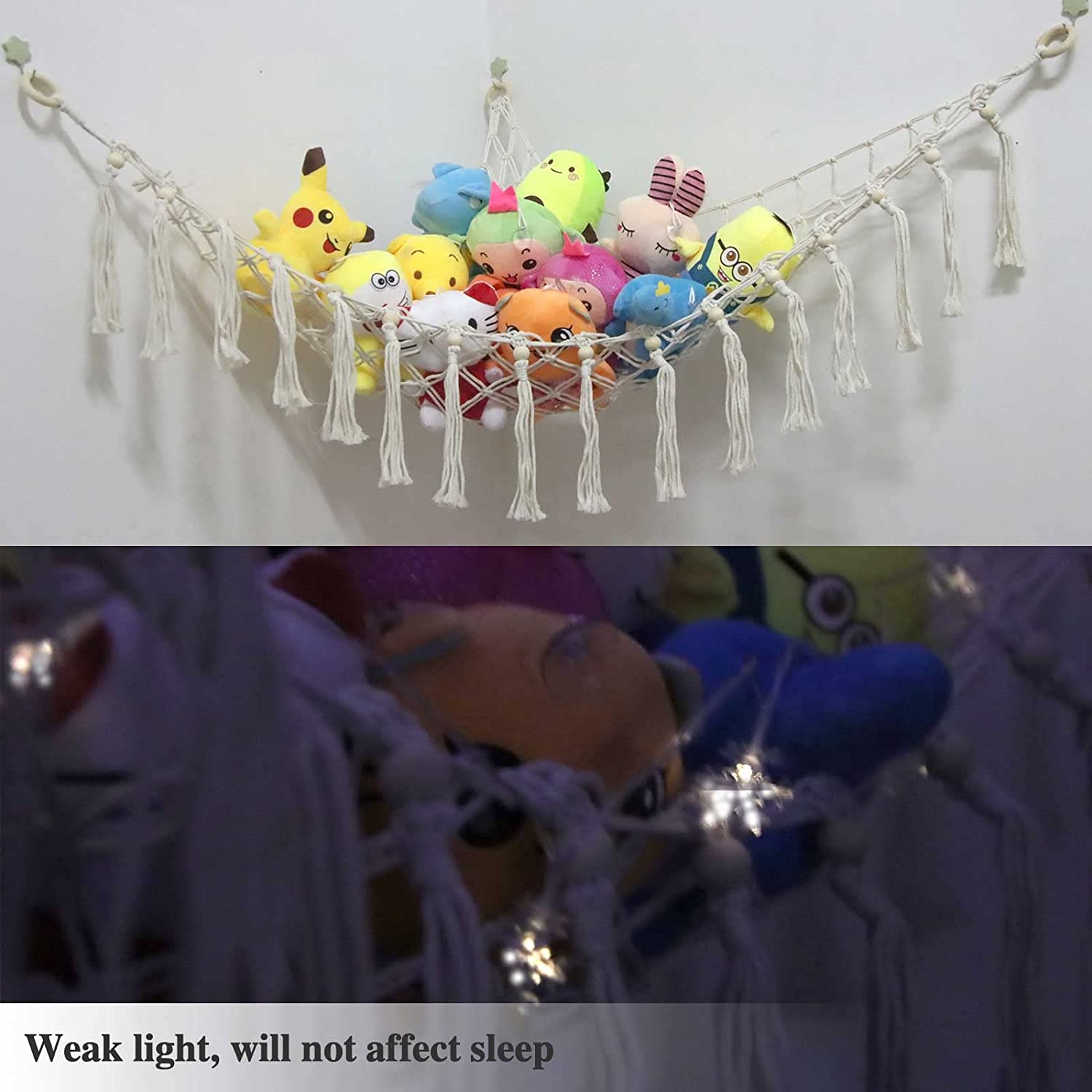 • 【Bohemian Style】Romantic bohemian style, handmade lace rope, decorated with 16 tassels, and snowflake LED light. The toy net hammock for stuffed animals is not just an organizer, it's the perfect decoration.