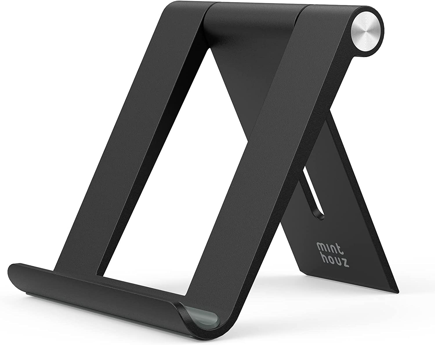 Minthouz Adjustable Cell Phone Holder for Desk - Foldable Phone Stand Compatible with iPhone 14 13 12 Pro Max Mini 11 Xr 8 Plus SE, iPad Mini, Switch, Android Smartphone, Tablets - Black