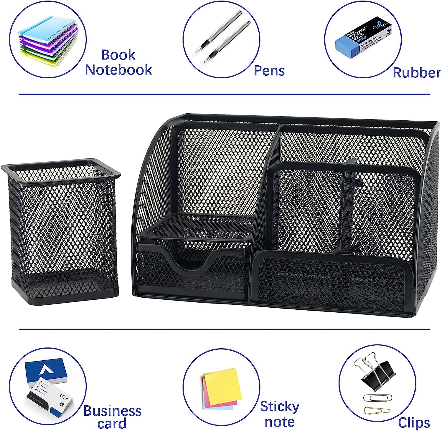 - [Durable and Versatile Design]This desktop organizer is not just for office supplies. Use it to store cosmetics, jewelry, mobile phones, business cards, and more. It's also a great choice for kids' desk organizers and storage. Made from lightweight mesh metal, this desk organizer is both sturdy and durable. The pen cup is designed to quickly store all kinds of pens and stationery.