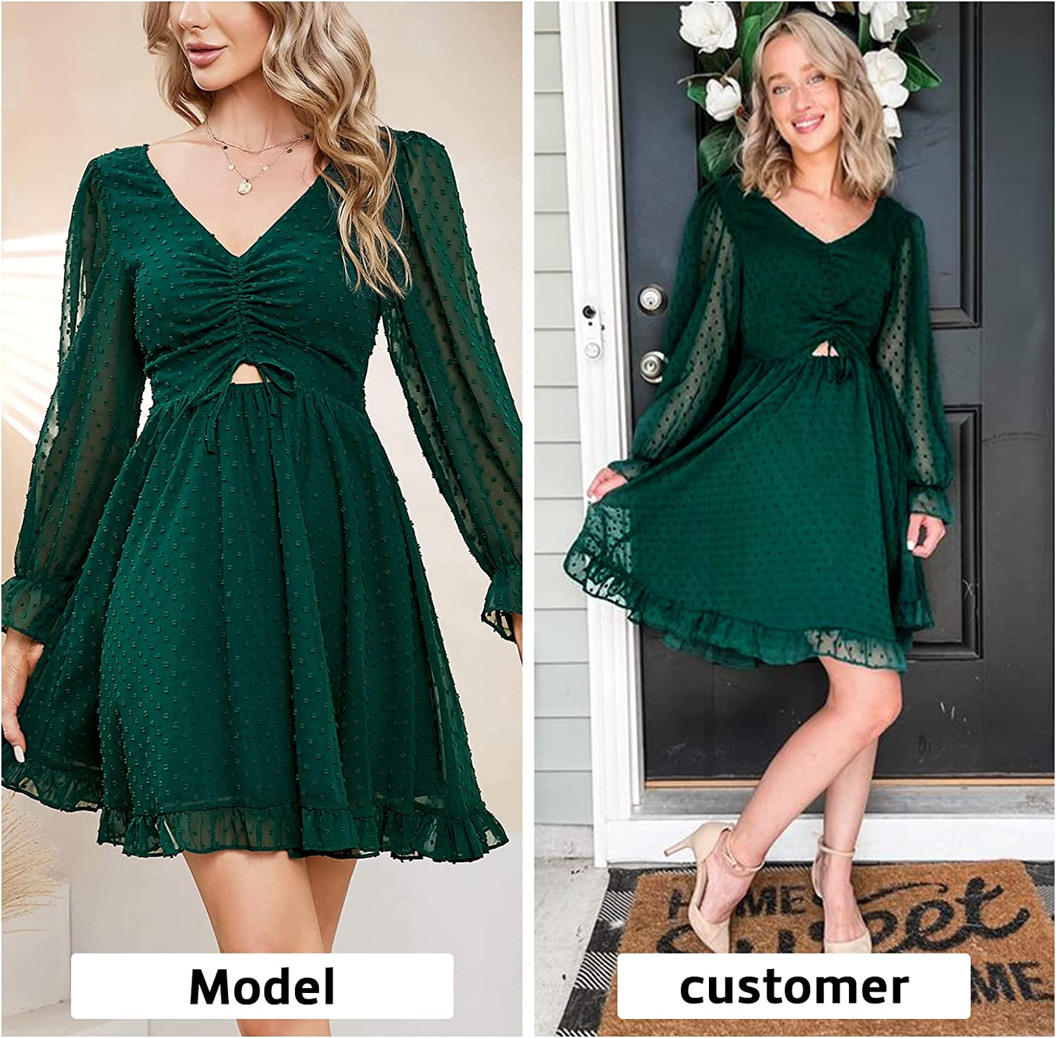 Design: v neck, puff long sleeve, ruffle cuff, drawstring, ruched front, cutout, smocked waistband, A line, frill hem, flowy swing dress, backless, tie back, Swiss dot, mini dress