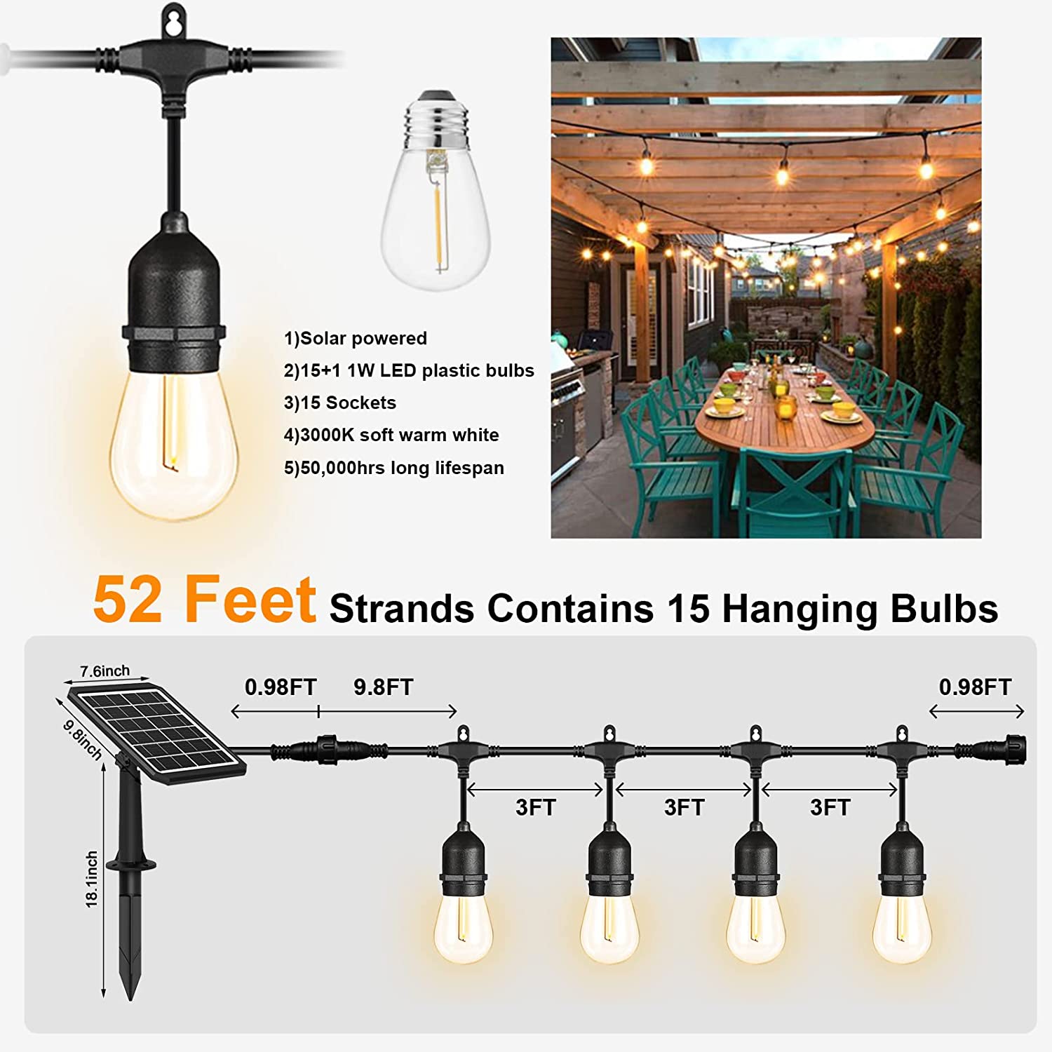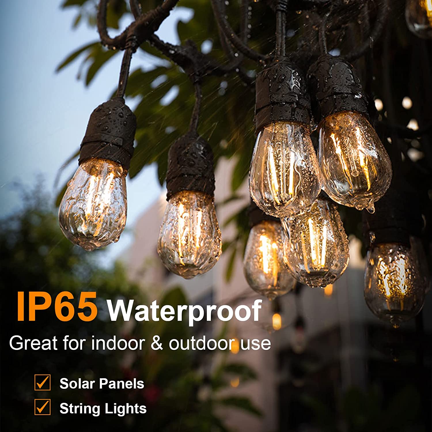 • ?【 DURABLE & WATERPROOF 】15 pcs + 1 extra well-made, unbreakable and shatterproof edison LED bulbs with heavy duty thicker strands making the solar outdoor string light stay sturdy outside in wind, rain & snow, or any other extreme weather, even drop it in accident.