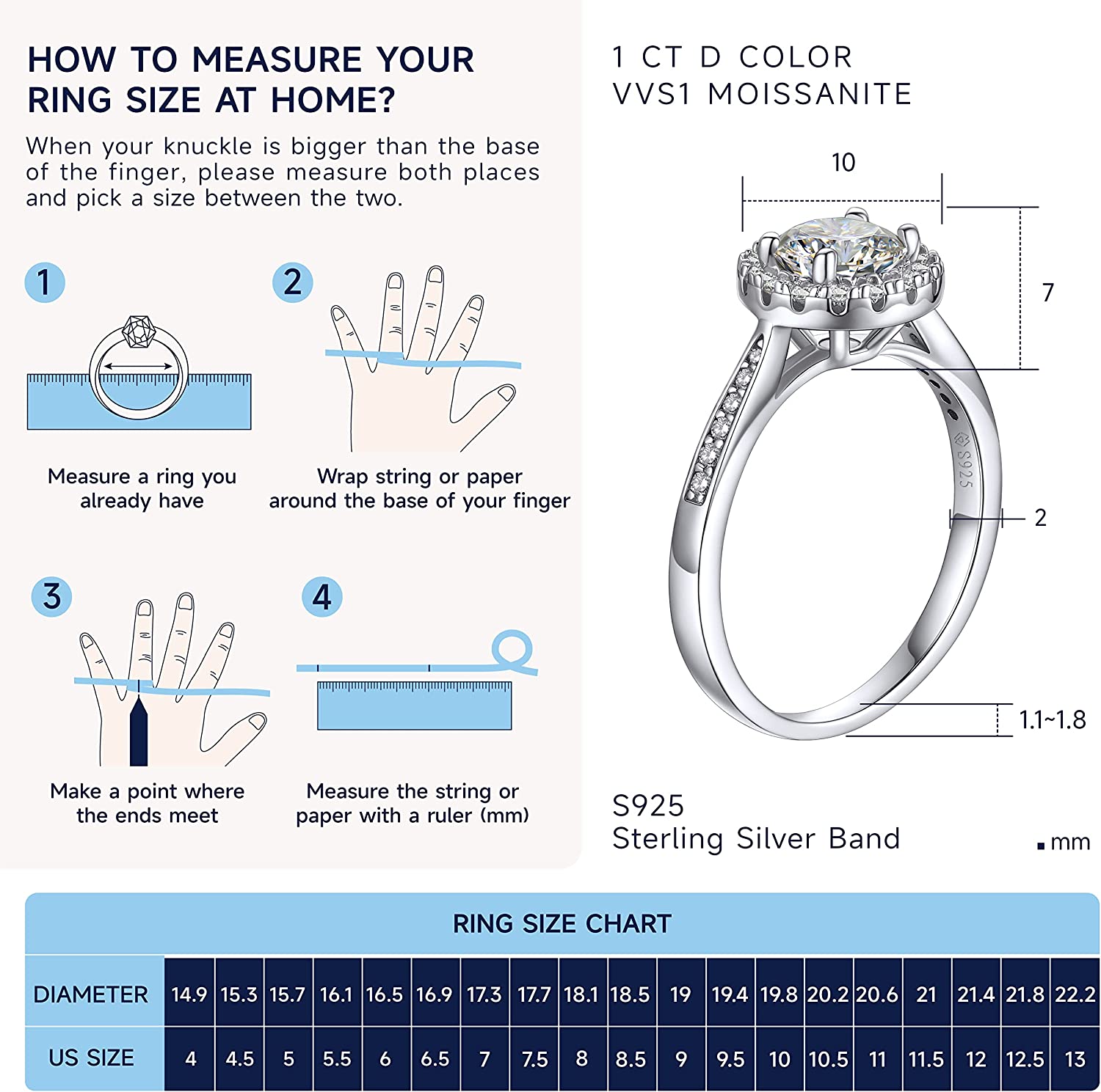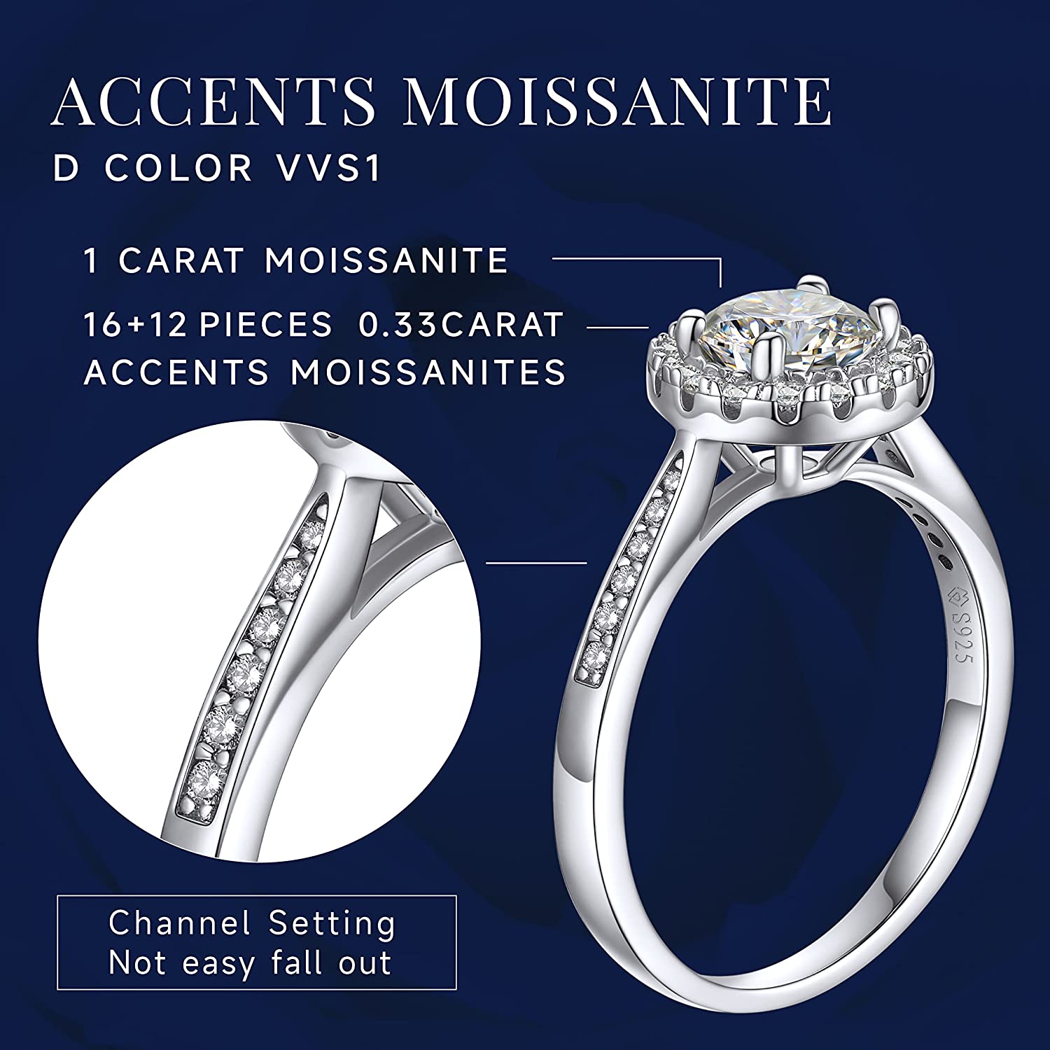 • ?【Gorgeous Design】➣ With a halo of micro-pave set 16 moissanites that revolving around the centre stone 1ct 4 prong setting, mossinate rings for women creates sparkly brilliance. 12 enchanting accent moissanite are set with solid 925 sterling silver. This beautiful ring will catch many sights for you!