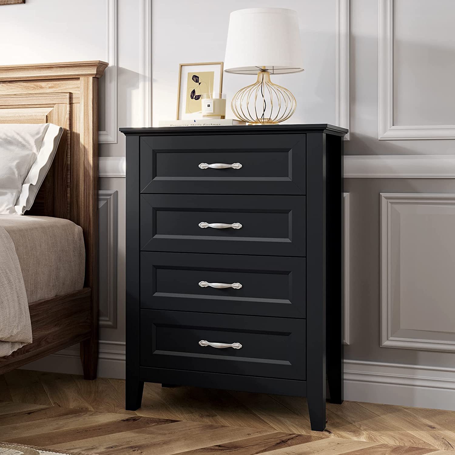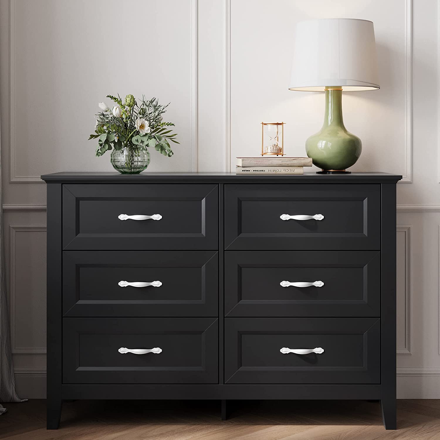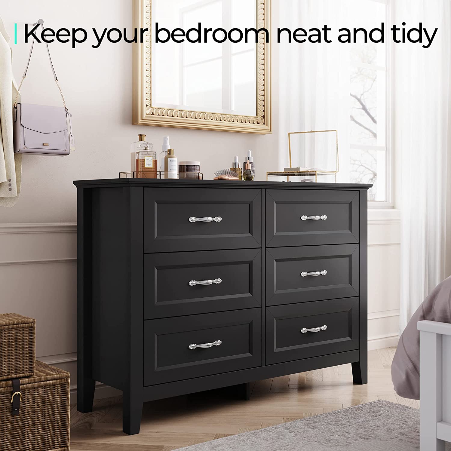 • [TIMELESS DESIGN] - Delicate wooden legs, framed drawer fronts and luxurious pull handles add appealing detail to this modern dresser, making it easy to adapt to any decorative style and creating a spacious look for your space.