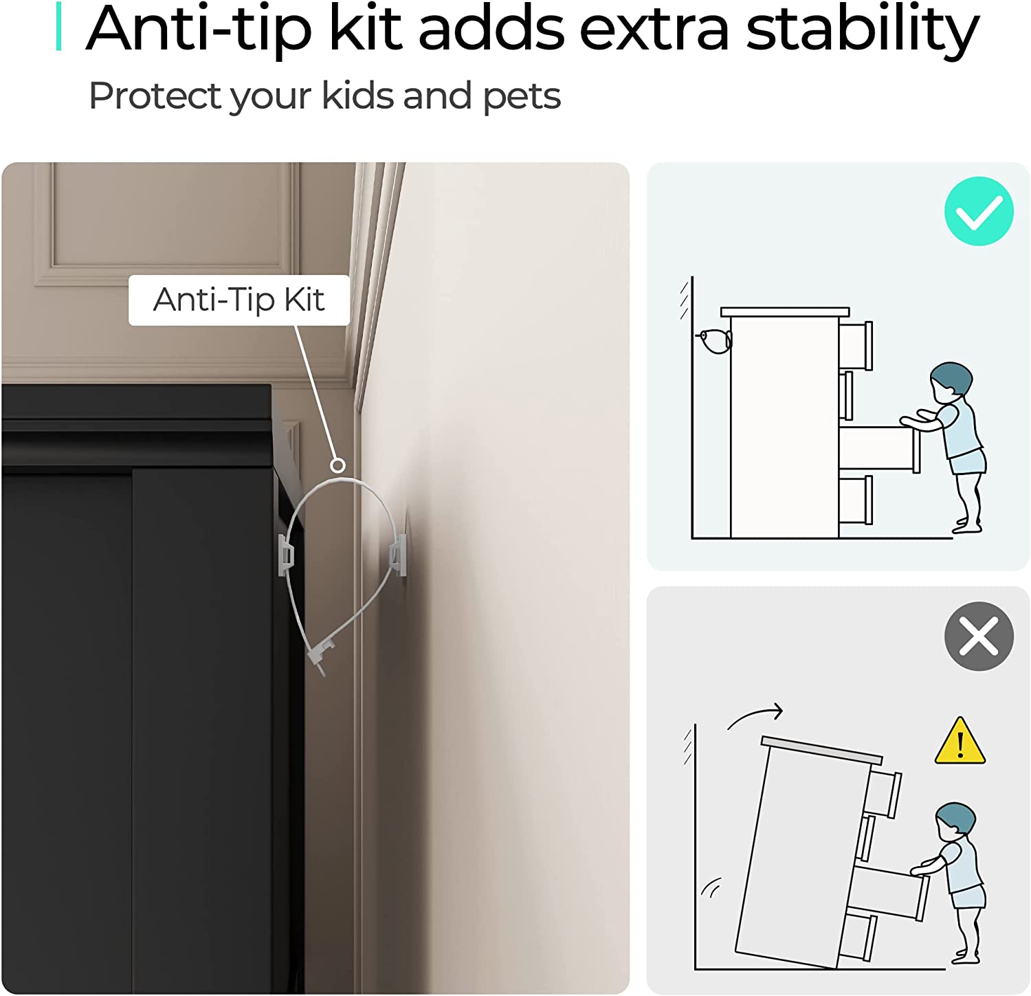 • [SAFETY FIRST] - Wall anchor kit provided to prevent tip-over incidents. Smooth metal runners on each drawer with safety stops prevent drawers from puling out.