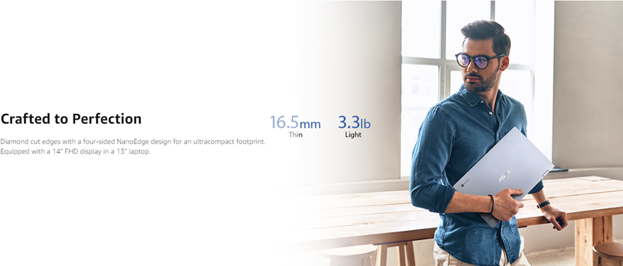 • 8GB LPDDR3 RAM; 64GB eMMC storage and 2x USB Type-C (Gen 1) and 1x Type-A (Gen 1) ports plus a backlit chiclet keyboard (*USB Transfer speed may vary. Learn more at ASUS website)