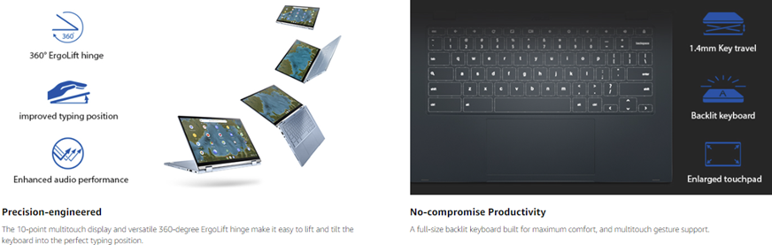 • The Full HD display has a durable 360 degree hinge that can be used to flip the touchscreen display to tent, stand, and tablet mode