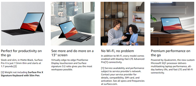 You’re always one step ahead. So is Surface Pro X. Sleek design and ultimate mobility combine with razor-thin bezels that take your ideas to the edge of the brilliant 13” touchscreen. Stay connected and work more efficiently anywhere with blazing-fast LTE.3 For a premium laptop experience on the go, click Surface Pro X Signature Keyboard with Slim Pen* in place. The Pen stores securely and recharges in the keyboard, so it’s always at your fingertips. Connections 2 x USB-C, 1 x Surface Connect port, Surface Keyboard connector port and 1 x nano SIM.