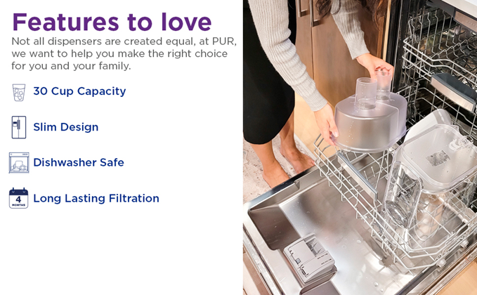 • EXTRA LARGE CAPACITY WATER FILTRATION SYSTEM – Enjoy refreshing, filtered water with the PUR 44-Cup Extra Large Water Dispenser. This 2.75-gallon water dispenser is dishwasher safe and fits perfectly on your countertop for everyday use or entertaining.