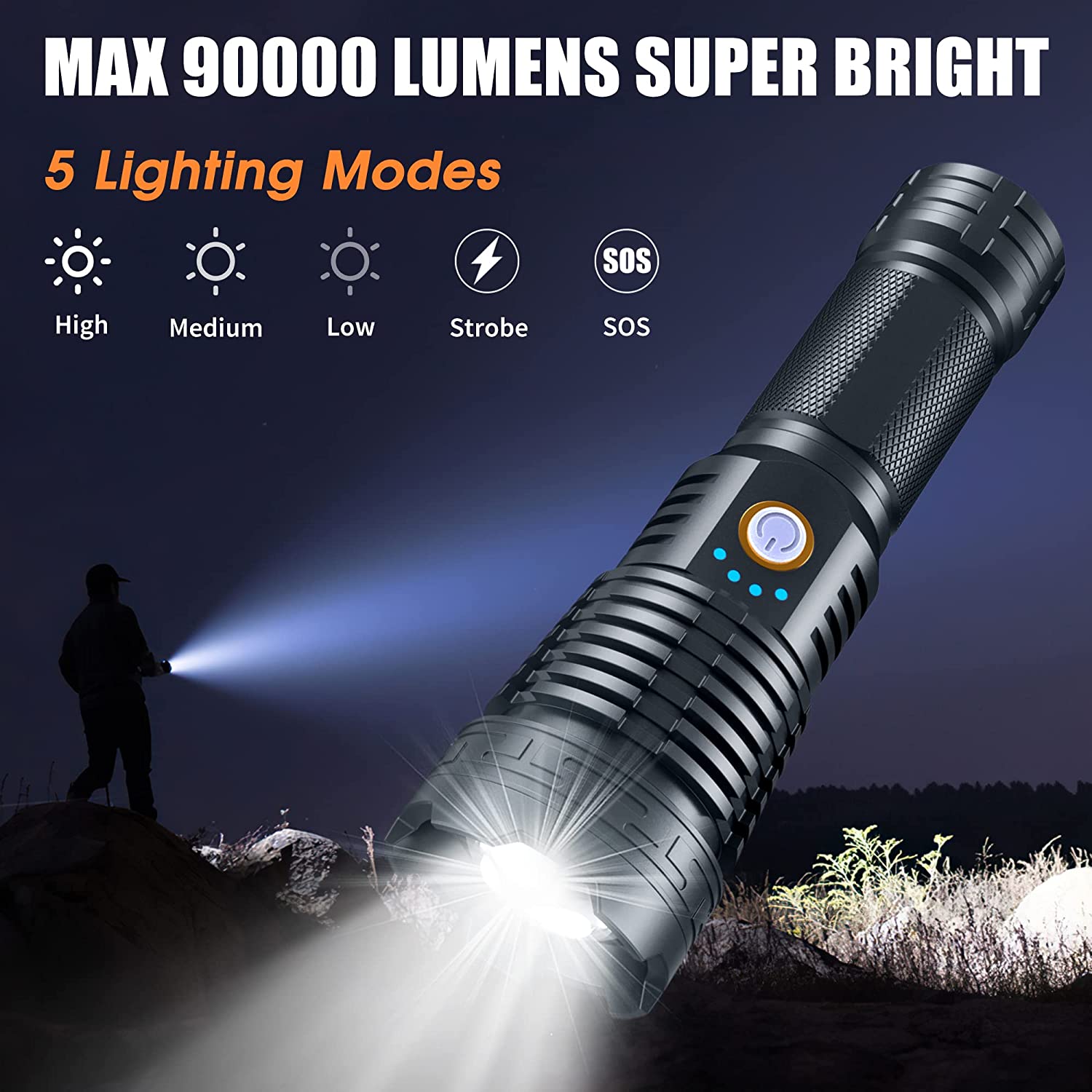 Dsstoc LED Rechargeable Flashlights High Lumens, 90000 Lumens Super Bright Tactical Flashlights with Rechargeable Battery, 5 Modes, Zoomable, IP67 Waterproof Flashlights for Camping Emergencies