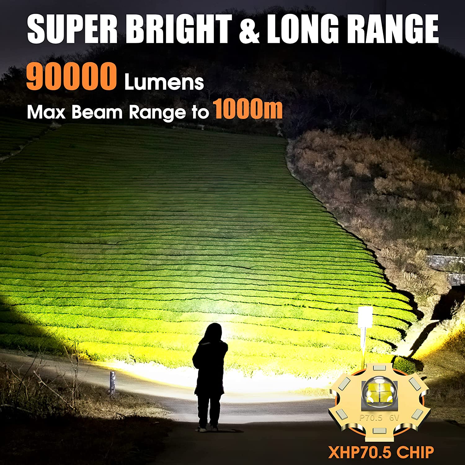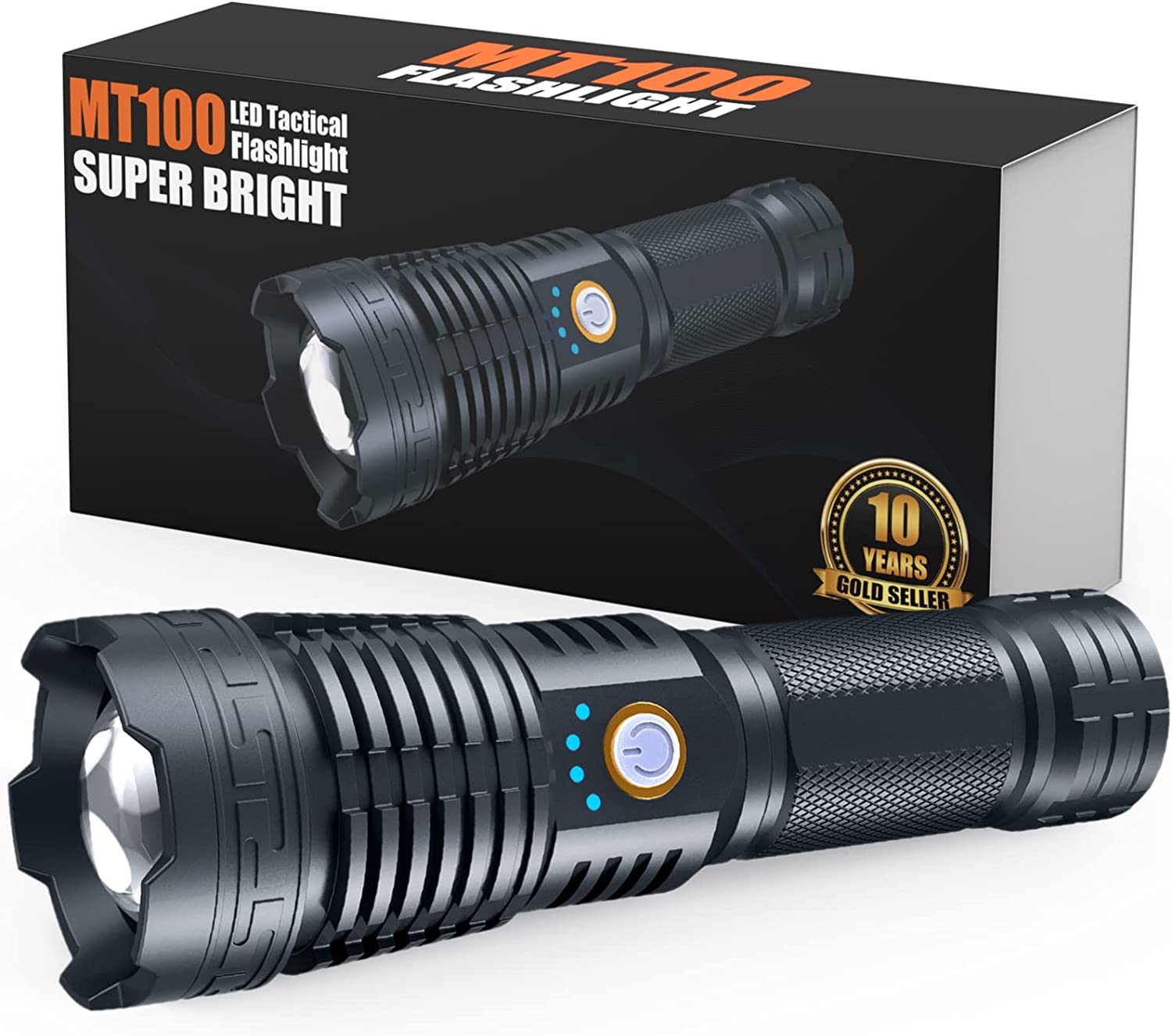 • ?【SUPER BRIGHT RECHARGEABLE LED FLASHLIGHT】?MT100 high lumens flashlight uses upgraded XHP70.5 lamp beads, which can provide up to 150,000 lumens of brightness. The rechargeable led flashlight can reach a maximum irradiation distance of 3000 feet, or easily illuminate a wide area of 2000 square feet. The super bright flashlight allows you to easily see any strange things in the dark, so you no longer worry about the dark.