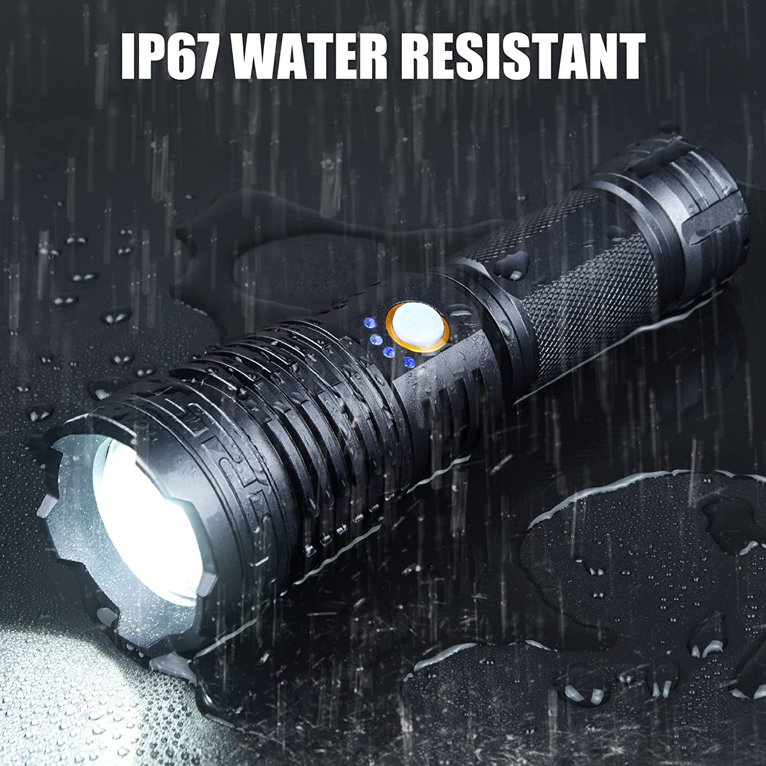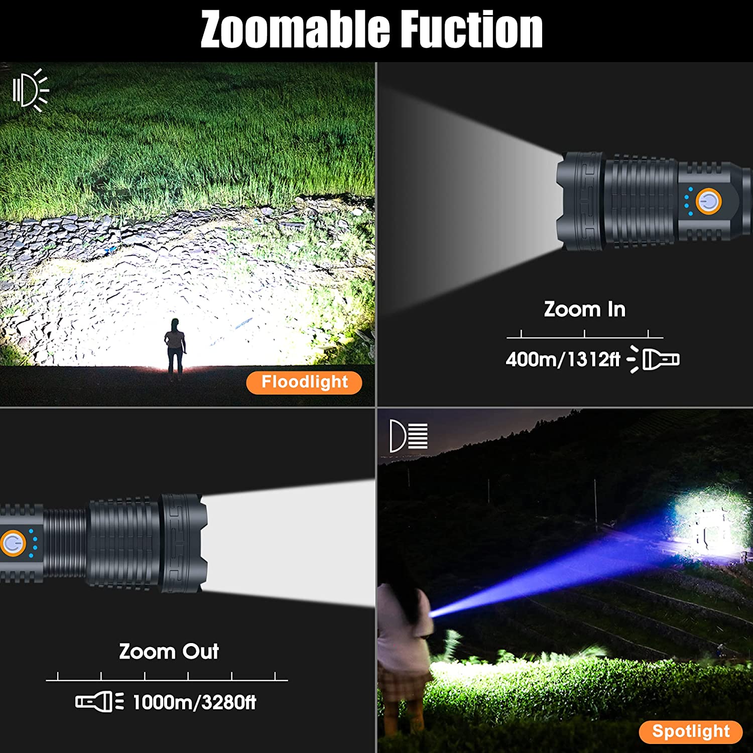 • ?【ZOOMABLE ADJUSTMENT】?Super bright LED flashlight has a telescopic zoom function. Zoom out the super bright rechargeable flashlights and switch to spotlight mode, suitable for long-distance observation, zoom in the super bright rechargeable flashlights and switch to floodlight mode, uitable for large area observation. According to your needs, you can choose to use spotlights or floodlights, which is very practical.