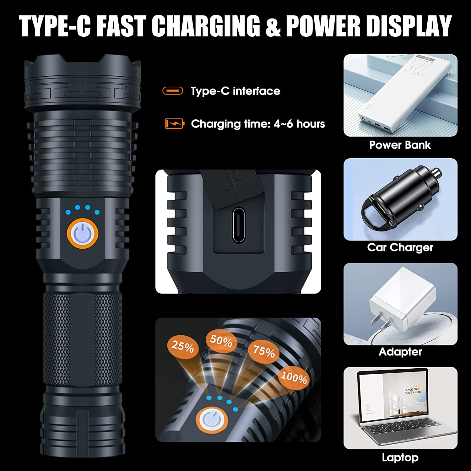 • ?【LOW BATTERY DISPLAY & TYPE-C FAST CHARGING】?MT100 high lumens tactical flashlight has a power display function. The power indicator light above the handheld flashlight can help you clearly understand the battery usage (100%, 75%, 50%, 25%). With the Type-C fast charging interface, you can use the USB charging cable (included) to connect to an AC charger, car charger, mobile power bank or computer to charge the high-power flashlight.