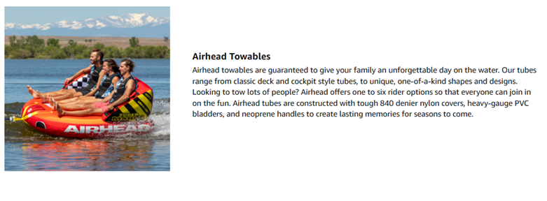 • 1-3 rider tube for boating and watersports.Unique Backrest/Front Riser ConstructionMultiple Grab Handles with Knuckle GuardsFront & Back Tow Points for different riding experiencesHeavy-Duty Full Nylon Cover with Zipper and EVA Foam Pads for a Comfortable Ride
