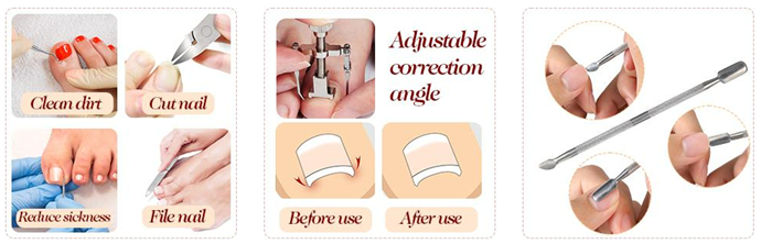 • Ingrown toenail corrector: the toenail corrector adopts lever mechanics to change the angle of nail growth, then the nail will become flattened and widened; You can adjust the sides of the corrector to adapt different nails