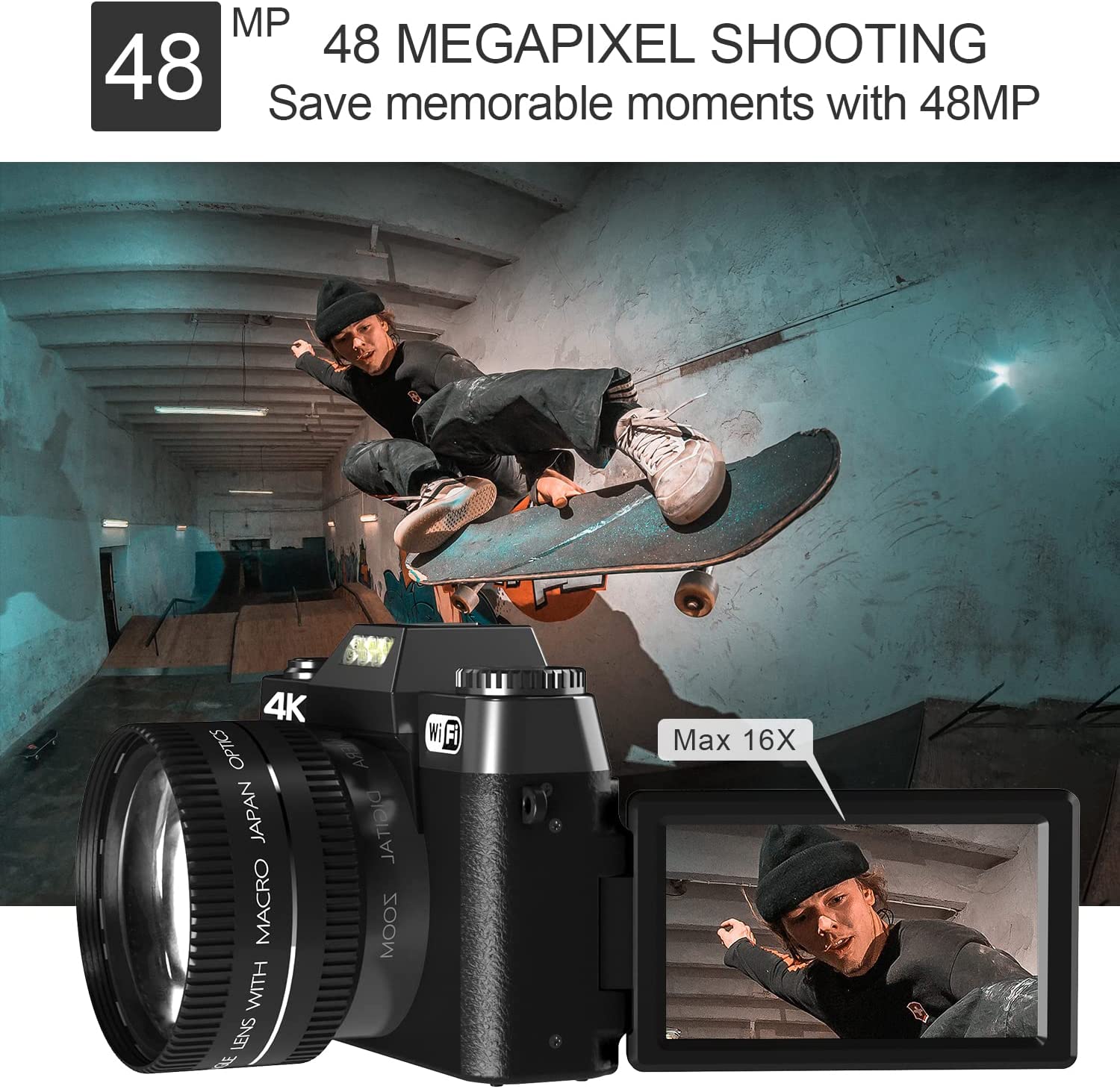 • ?Digital Camera for Photography ?: The 4k small digital camera with 30fps video resolution and 48 megapixel, provides a smooth shooting experience than 2.7K or 1080P video cameras, which can capture every excellent moment while vlog recording, the best camera for youtube. Equipped with wide angle & macro lenses and supports 16X Digital Zoom to get closer focus from far away and take close-up with clear details photos or recorder a wider range of scenery.