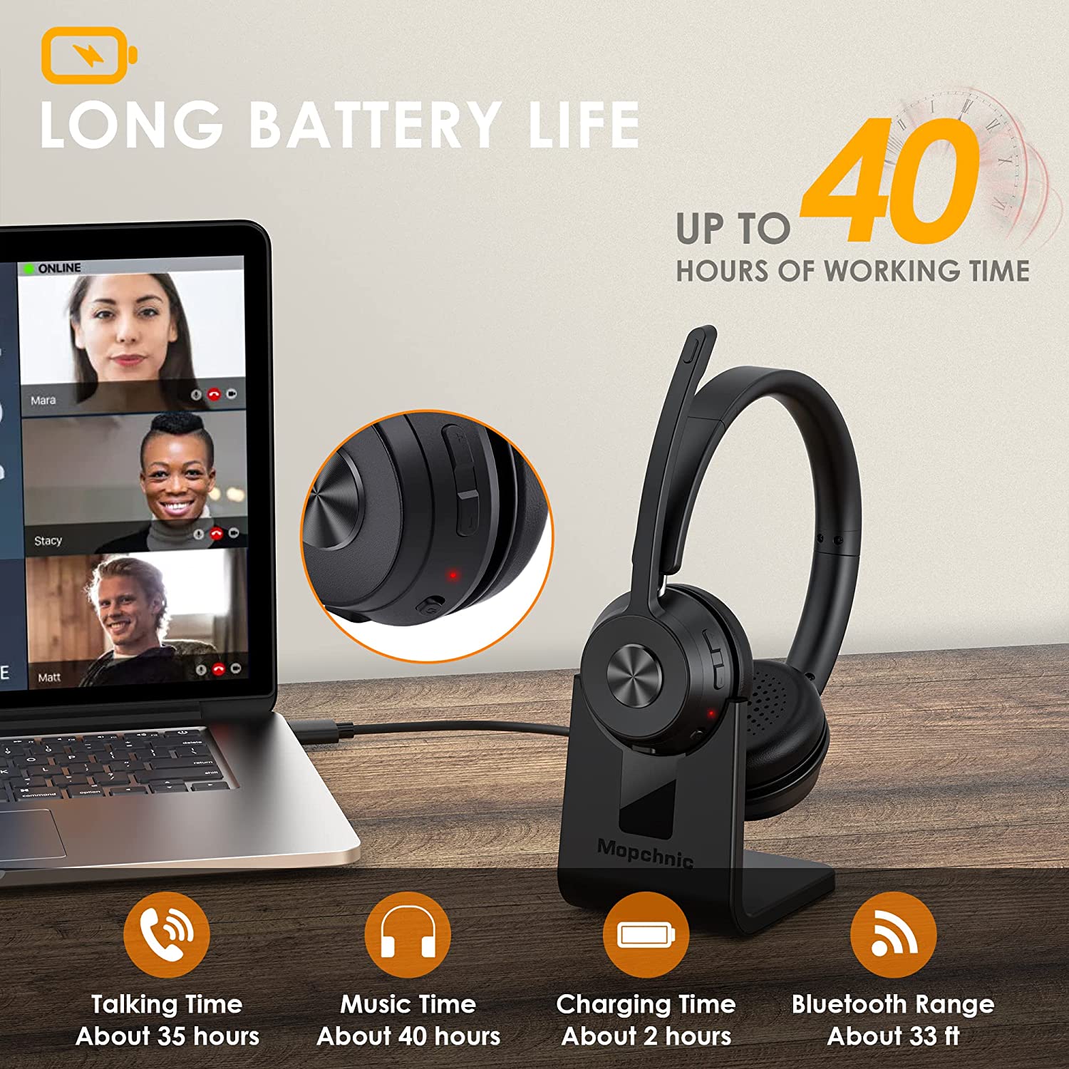 【Long Battery Life & Exclusive Charging Base】Our wireless headset is equipped with a 600mAh battery, which provides over 37 hours working time and 230 hours standby time after fully charged. Fully charged only need about 2 hours. Besides, the Bluetooth headset comes with a charging stand, you can put the headset on it to charge. NOTE: Please turn off the headset before charging the headset.