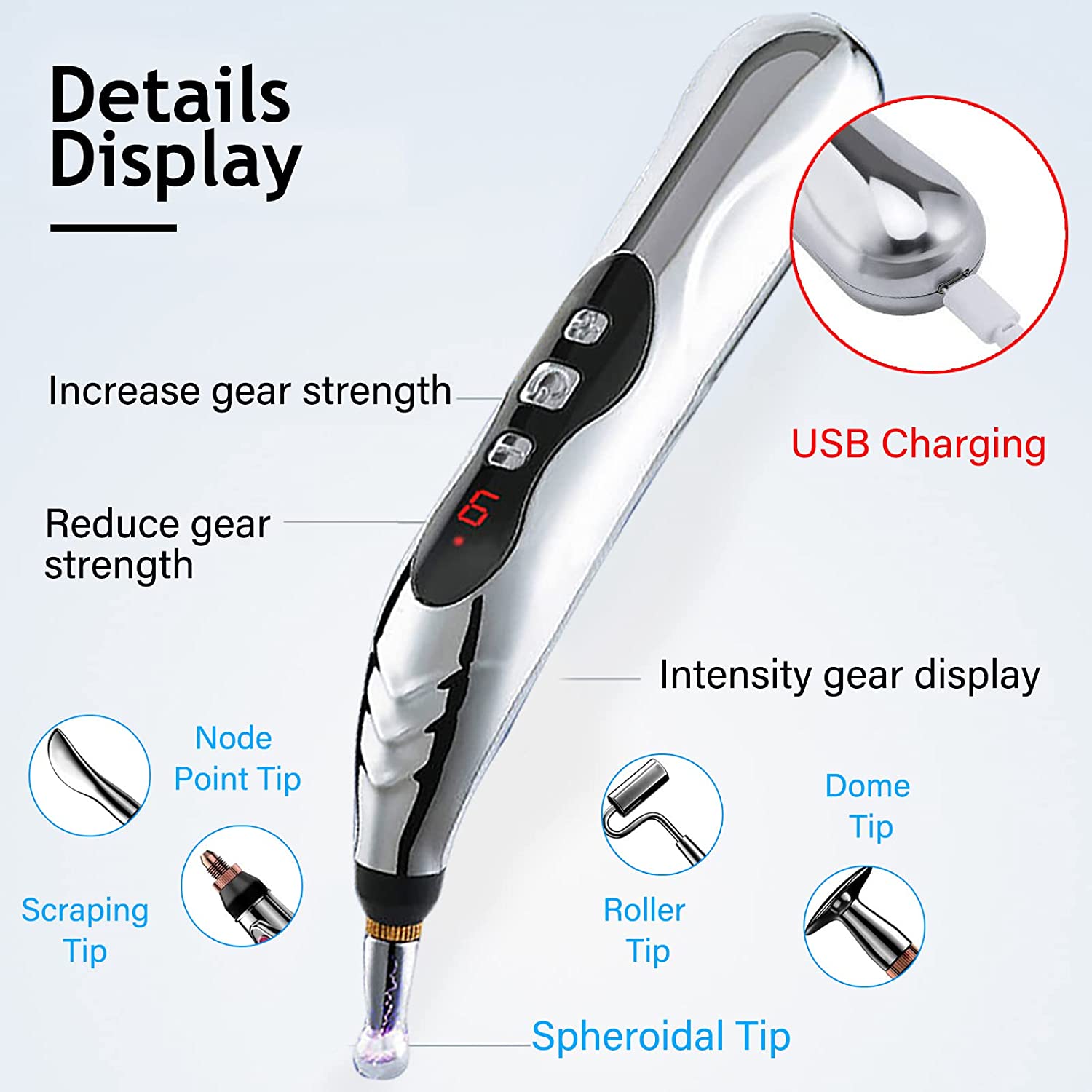 Acupuncture pen can make you more youthful and energetic, and keep you away from troubles and fatigue. Advantage: 1. Pain relief: Targets pain, muscle tension and general health of the face to boost blood circulation to the skin, leaving you rejuvenated, radiant and youthful. 2. Bioelectricity regulation to cure: Based on the principle of magnetic therapy, your acupuncture pen acts on the meridian points, giving a simple massage to the muscles, which is very helpful for relieving persistent muscle and joint pain. 3. Multifunctional application: Your electric acupuncture pen comes with 5 unique massage heads with 9 adjustable intensity levels to suit your needs and automatically turns off the feature to prevent overheating and save energy. 4. Flexible and easy to use: Most importantly, one should understand the acupuncture points and how they work in order to use the device effectively. Please check the user manual before use. Press the "+" or "-" key to switch to the grade you want, suitable for home use and convenient for you to take with you when you travel. 5. A variety of massage methods: Dome type, Node Type, Sphere Type, Type of scraping, Acupuncture, How to Use: Step 1 :Choose a massage head and install it. Step 2 :Adjust the intensity to find the level that works for you. Step 3 :Hand holding an electronic acupuncture pen to find pain points or acupuncture points that need treatment.